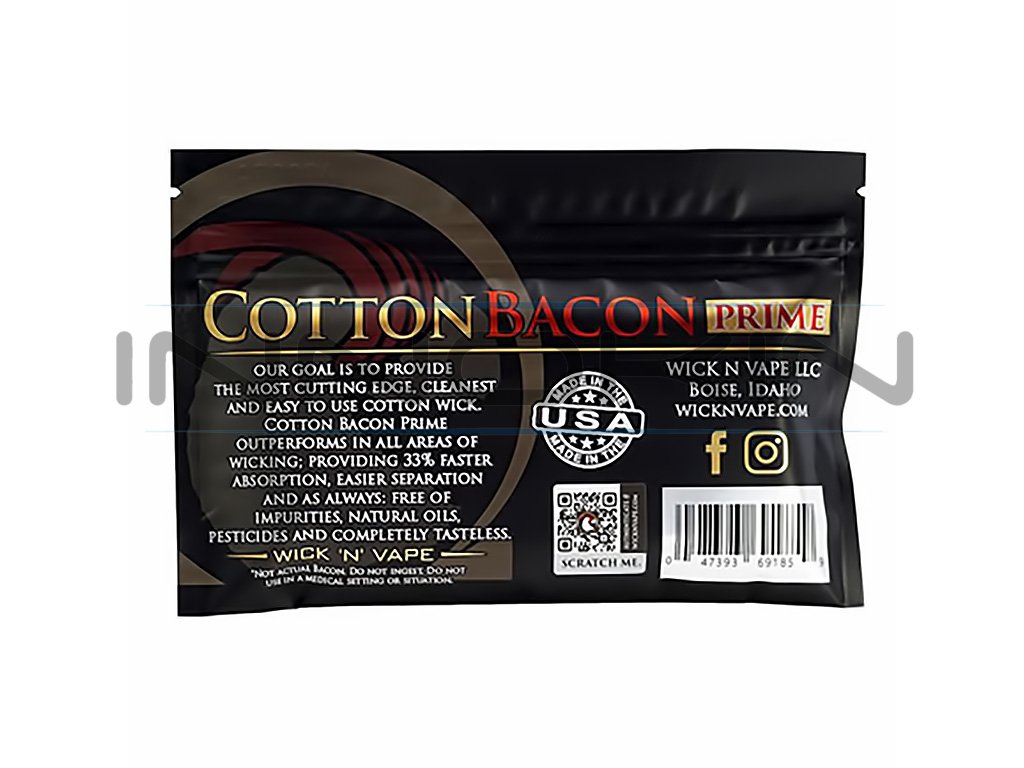 Přírodní vata Cotton Bacon Prime je posledním nástupcem velmi populární vaty Cotton Bacon V2, známého amerického výrobce Wick 'N' Vape. Tato vata je vyrobena ze 100% přírodní bavlny bez jakéhokoliv chemického ošetření, či bělení. Svým složením a kvalitou zpracování se jedná o špičkovou vatu s vynikajícími absorpčními schopnostmi, která se dokonale hodí pro příznivce DIY v oblasti namotávání vlastních spirálek.