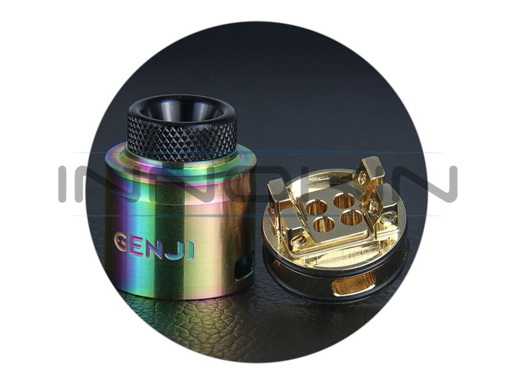 Tigertek Genji je nový RDA atomizér od stejnojmenného výrobce, který přichází s perfektní základnou pro dvě spirálky a vylepšeným systémem airflow pro dosažení maximálního prožitku z produkované chuti. Celá konstrukce je velice jednoduchá, stejně jako u většiny RDA atomizérů. Nemusíte se tedy bát náročné údržby, atomizér se skládá pouze z několika částí. Mezi hlavní součásti patří široký náustek pro zisk chutné páry, zároveň se v základním balení nachází náustek typu 510 s redukcí, můžete si tedy zúžit otvor pro výstup páry do úst, čímž si vychutnáte jemnější chuť, než v případě širokého náustku.