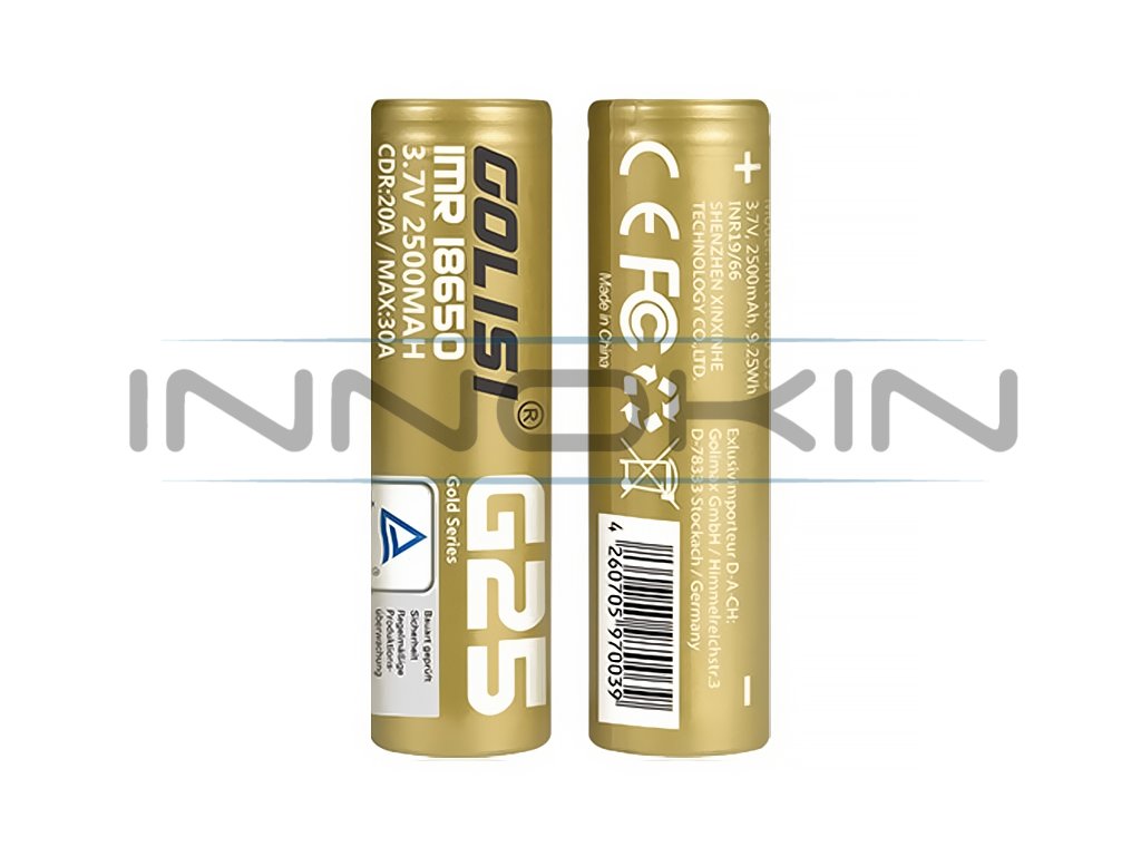 Golisi G25 je dobíjecí baterie 18650, která je úsporná a navržená pro spolehlivé a dlouhodobé používání. S kapacitou 2500 mAh vydrží dlouho a poskytuje konstantní výstup až 20 A , i když kapacita klesne pod 40 %. Při krátkodobém vyšším zatížení absorbuje špičkové proudy až 30 A, přičemž pro větší bezpečnost je vybavena vyrovnávací pamětí. Díky až 800 nabíjecím cyklům má dlouhou životnost, a je tak šetrná k životnímu prostředí. Díky mnoha bezpečnostním prvkům je tak jeho používání bezpečné a účinné. Všechny baterie Golisi se vyznačují jedinečnými vlastnostmi, které podporují bezpečné používání. Typ baterie IMR 18650, konstantní vybíjecí proud 20 A, jmenovité napětí 3,7 V, ybíjecí napětí 2,75 V, nabíjecí napětí: 4,20 ± 0,05 V, životnost: >800 nabíjecích cyklů. Bezpečnostní certifikáty CE, ROHS, FCC, MSDS, WEEE, UN38.3, IEC62133, pádový test.