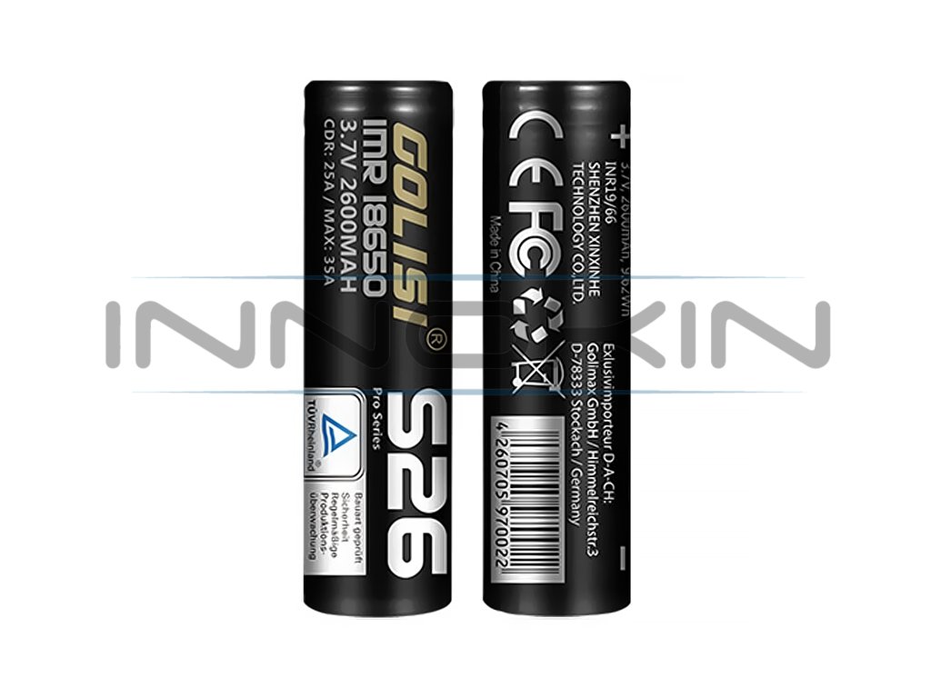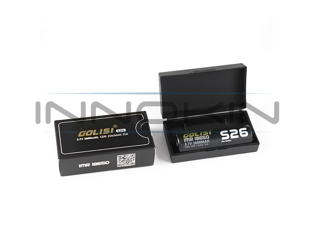 Golisi 18650 S26 je vysoce výkonný lithium-iontový článek typu 18650. Kombinuje vysoký konstantní vybíjecí proud až 25 A s kapacitou 2600 mAh. Díky až 800 nabíjecím cyklům má dlouhou životnost, a je tak šetrná k životnímu prostředí. Díky mnoha bezpečnostním prvkům je tak jeho používání bezpečné a účinné. Pevné a robustní smršťovací fólie, které naleznete na všech dobíjecích bateriích GOLISI® rovněž zajišťují dlouhodobou bezpečnost. Baterie se dodávají v boxu na baterie pro jejich pohodlné a bezpečné přenášení. Typ baterie IMR 18650, kapacita 2600 mAh, konstantní vybíjecí proud 25 A, jmenovité napětí 3,7 V, nabíjecí napětí 4,20 ± 0,05 V, životnost: >800 nabíjecích cyklů. Bezpečnost CE, ROHS, FCC, MSDS, WEEE, UN38.3, IEC62133, pádový test.
