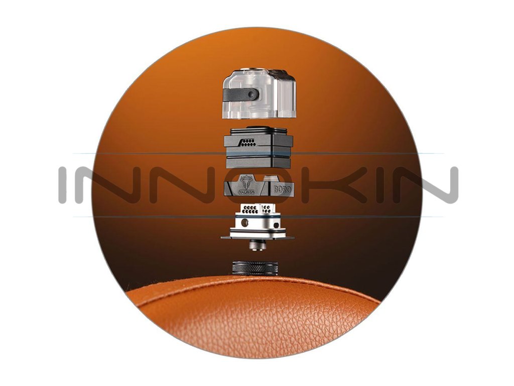 Na těle tanku THC Tauren Boro se nachází hned dva plnící otvory pro ještě jednodušší a variabilnější možnosti doplňování. Jednou z jeho hlavních předností je také možnost nastavení délky tanku a možnost nastavení airflow prostřednictvím airflow kroužku na těle.