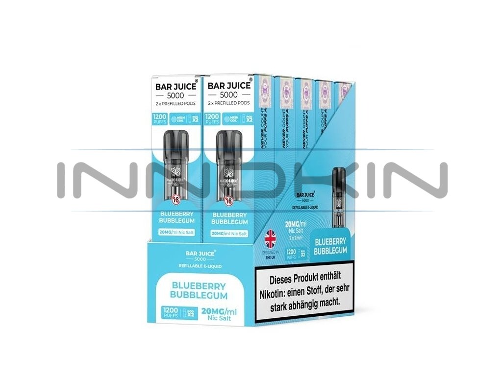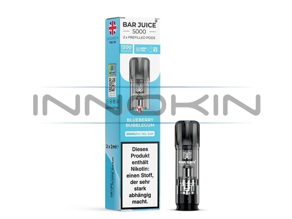 Parametry a specifikaceVýrobce: Bar Juice Žhavící hlava: Integrovaná v Podu Materiál spirálky: Mesh Objem: 2ml Styl potahování: MTL (Mouth-to-Lung) Příchuť: Blueberry Bubblegum (Borůvka, Žvýkačka) Obsah nikotinové soli: 20mg/ml Způsob plnění: Nelze, již předplněné Legislativa: TPD kompatibilní