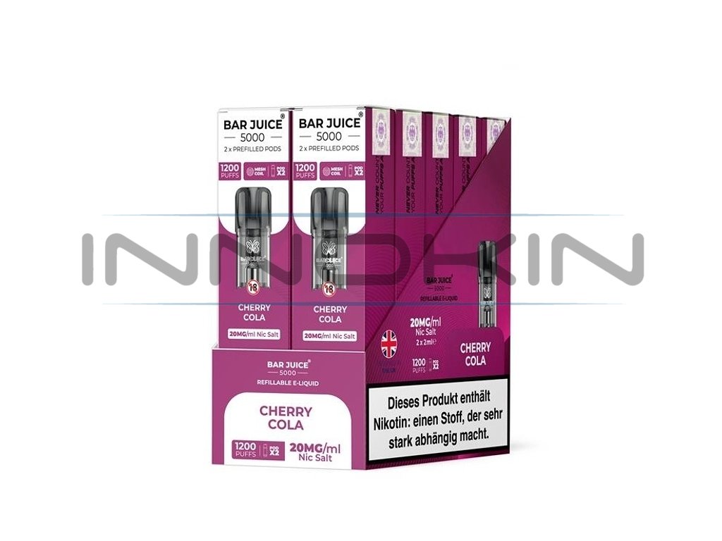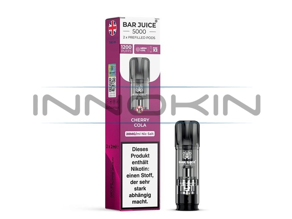 Parametry a specifikaceVýrobce: Bar Juice Žhavící hlava: Integrovaná v Podu Materiál spirálky: Mesh Objem: 2ml Styl potahování: MTL (Mouth-to-Lung) Příchuť: Cherry Cola (Třešeň, Kola) Obsah nikotinové soli: 20mg/ml Způsob plnění: Nelze, již předplněné Legislativa: TPD kompatibilní