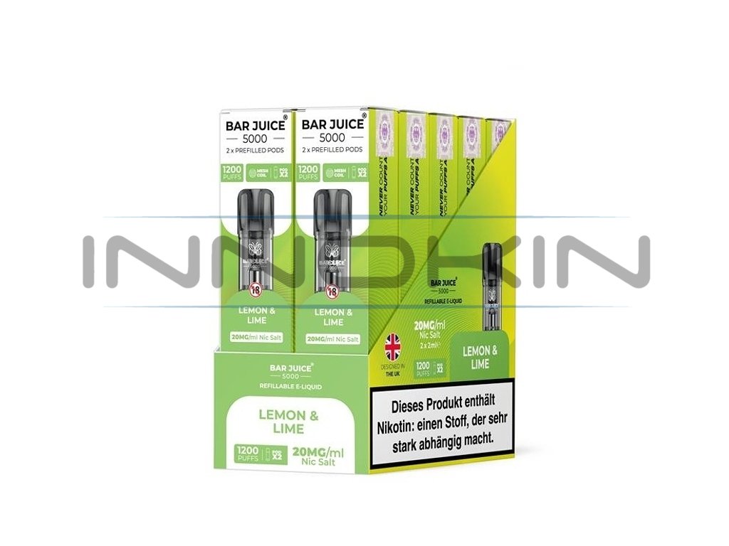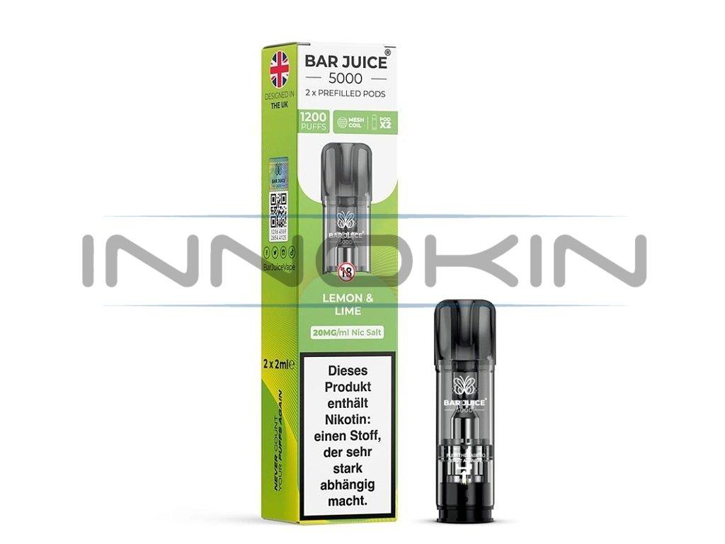 Parametry a specifikaceVýrobce: Bar Juice Žhavící hlava: Integrovaná v Podu Materiál spirálky: Mesh Objem: 2ml Styl potahování: MTL (Mouth-to-Lung) Příchuť: Lemon and Lime (Citrón, Limetka) Obsah nikotinové soli: 20mg/ml Způsob plnění: Nelze, již předplněné Legislativa: TPD kompatibilní