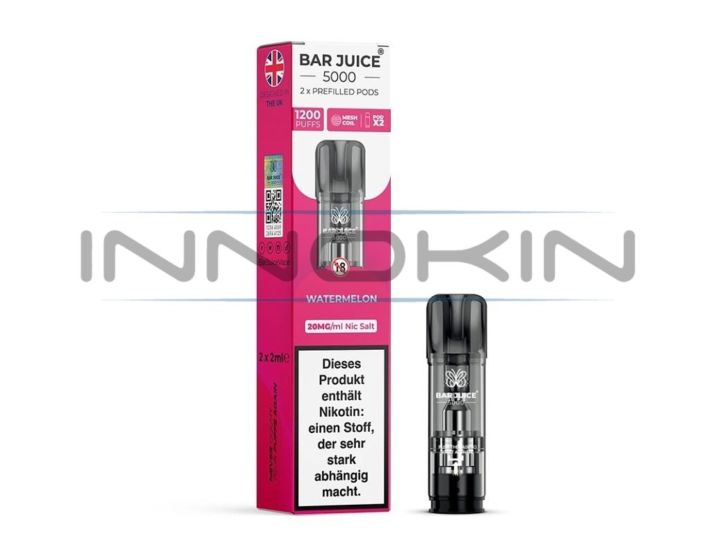 Parametry a specifikaceVýrobce: Bar Juice Žhavící hlava: Integrovaná v Podu Materiál spirálky: Mesh Objem: 2ml Styl potahování: MTL (Mouth-to-Lung) Příchuť: Watermelon (Vodní meloun) Obsah nikotinové soli: 20mg/ml Způsob plnění: Nelze, již předplněné Legislativa: TPD kompatibilní