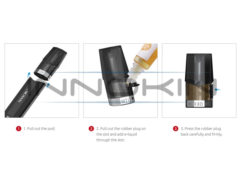 Pod Cartridge sloužící jako zásobník pro Vaší oblíbenou náplň (e-liquid), která v tomto případě slouží zároveň i jako náustek a nosič samotné žhavící hlavy. V tomto případě se jedná o dvouspirálkovou žhavící hlavu s celkovým odporem 0,8Ω se kterou si maximálně vychutnáte Váš oblíbený e-liquid. Tato Pod Cartridge s uvedeným odporem vytváří opravdu solidní dým a je vhodná ke klasickému způsobu potahování (MTL) jako u klasických cigaret. Je nutné také dodat, že tato Cartridge má velmi solidní objem vzhledem k malým rozměrům e-cigarety, a to rovné 3ml. Její plnění je velmi snadné a provádí se sejmutím boční silikonové krytky. Její instalace je velmi jednoduchá a provádí se pouhým zasunutím do těla cigarety a o její správné držení se postará dvojice zabudovaných magnetů. Stav hladiny je díky průhlednosti Cartridge dobře vidět, a tak vždy vidíte, jak na tom aktuálně jste a jestli můžete třeba vyrazit na celodenní výlet.