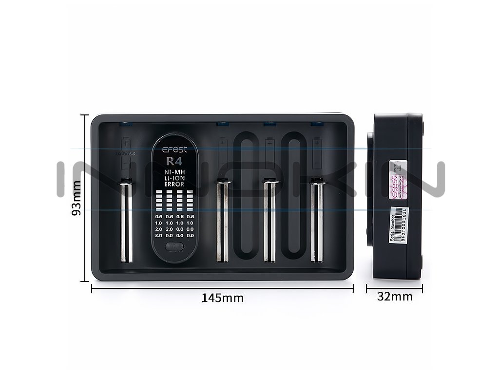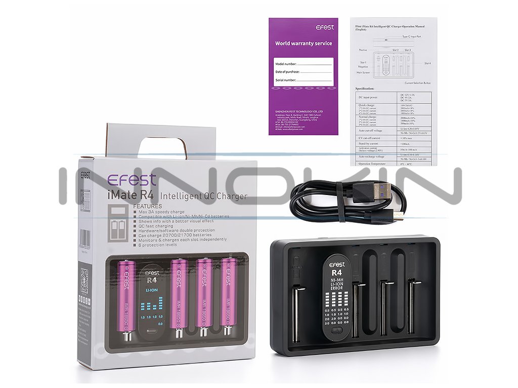Inteligentní rychlá QC nabíječka Efest iMATE R4 je cenově dostupná a přesná nabíječka baterií, která dokáže bezpečně nabíjet až čtyři baterie současně, je vyrobena z odolných a nehořlavých PC materiálů a je navržena tak, aby baterie v přihrádkách nabíjela konzistentním tempem. Automaticky detekuje typ baterie, reguluje a řídí množství a rychlost, jakou se baterie může nabíjet, a díky funkci automatického vypnutí zabraňuje přebíjení, čímž dále udržuje životnost bateriových článků. Inteligentní detekce typu baterie a její velikosti, zobrazení odhadované doby nabíjení. Podporuje baterie typu 10440, 14500, 14650, 16340, 16650, 17650, 17670, 18350, 18490, 18500, 18650, 20700, 22650, 26500, 26650, AAAA, AAA, AA aj. DC Input 12V / 1.5A 9V / 2A 5V / 2A.