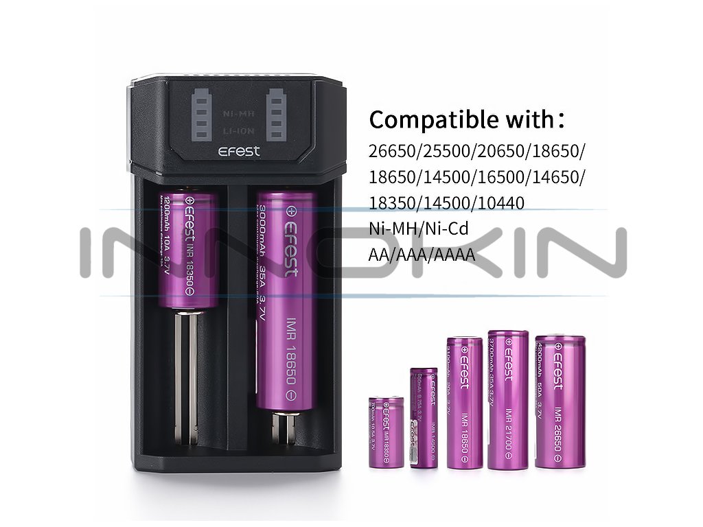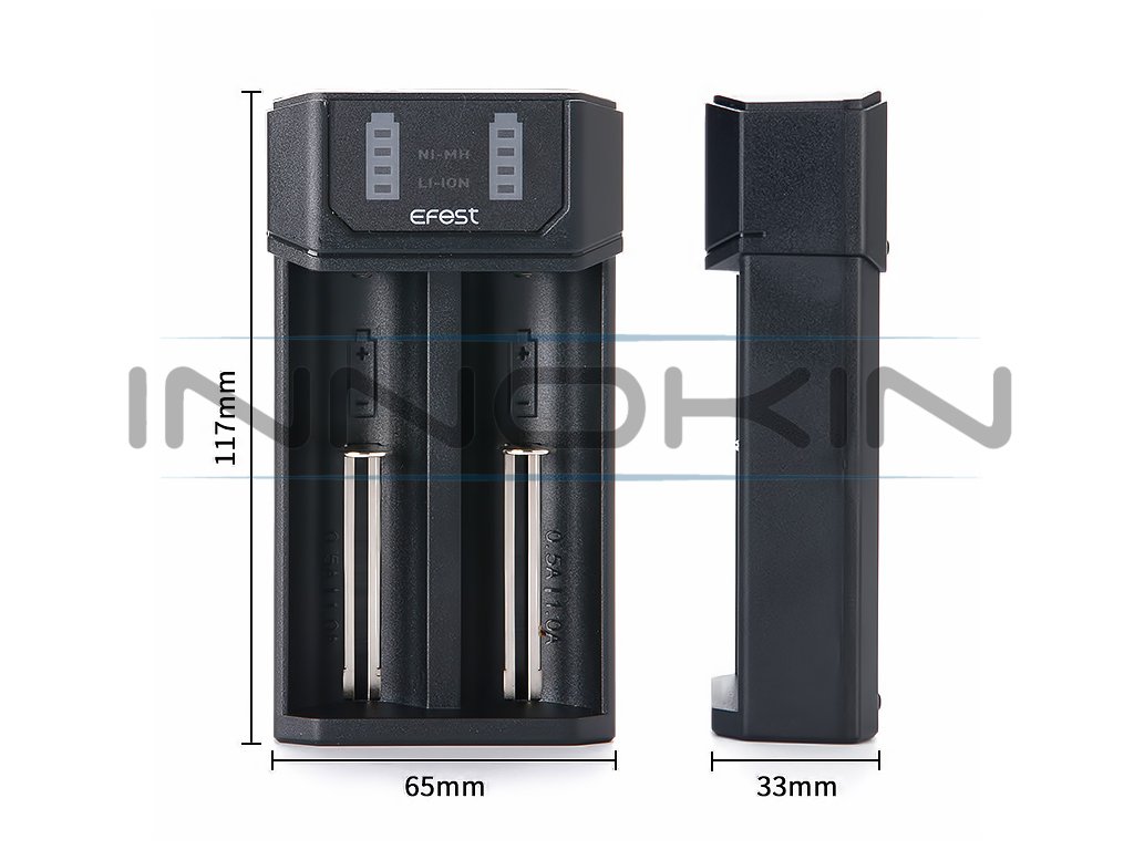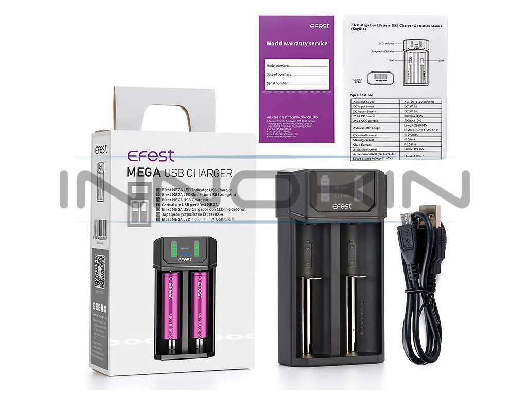 Efest Mega USB je šikovná nabíječka pro nabíjení Li-ion a Ni-MH / NiCd baterií. Nabíječka je nabíjená 5V pomocí micro USB konektoru a její obsluha je velmi snadná. Jednoduše připojíte nabíječku ke zdroji a vložíte baterii. Nabíječka automaticky pozná typ článku a baterii začne nabíjet. Stav nabíjení je viditelný na LED indikátoru. Podporované články 10440, 14500, 16340, 17340, 18350, 18490, 18500, 18650, 26500, 26650, 20700, 21700, AAAA, AAA, AA, A, SC, C, F6. Nabíjecí proud 0.5A/1A. Velikost 118x65x34mm.