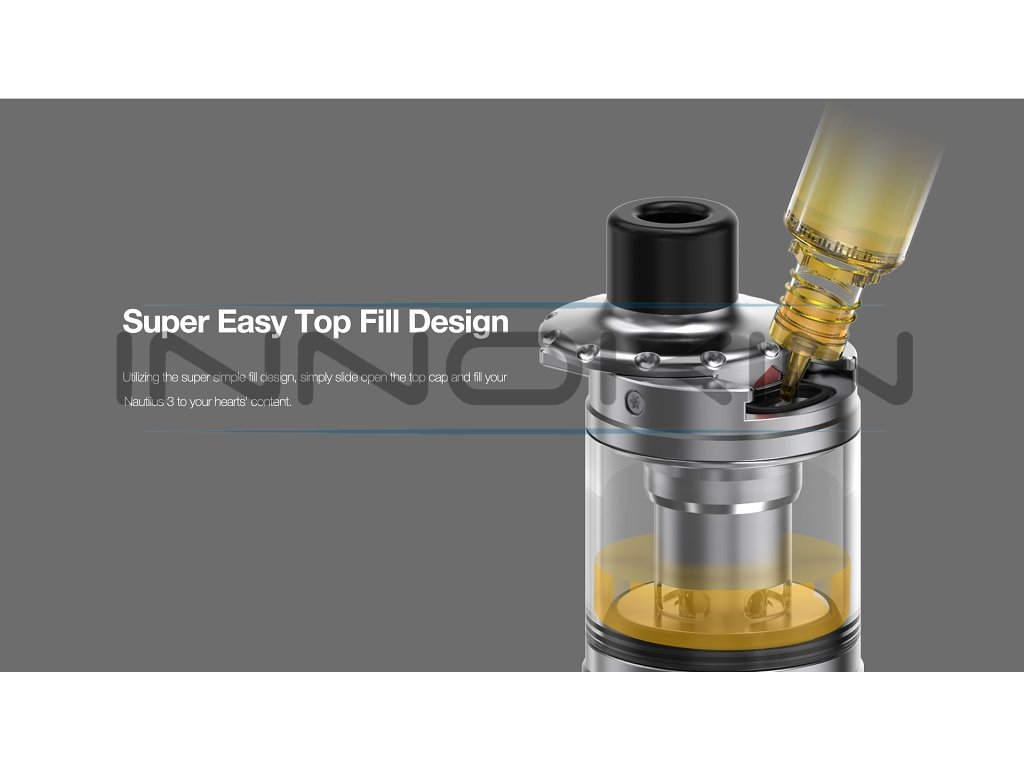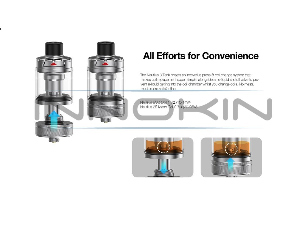 Další z řady nástupců legendárních Clearomizérů Aspire Nautilus, tentokrát ve třetí verzi, vyrobený z nerezu a skla o průměru 24mm. Plně kompatibilní se všemi žhavícími hlavami Nautilus. Propracovaný systém přívodu vzduchu (Airflow) 7 stupňů. Vhodný jak pro MTL, tak DL styl vapování. Jednoduché horní plnění e-liquidem. 2x žhavící hlava Nautilus v SETU.