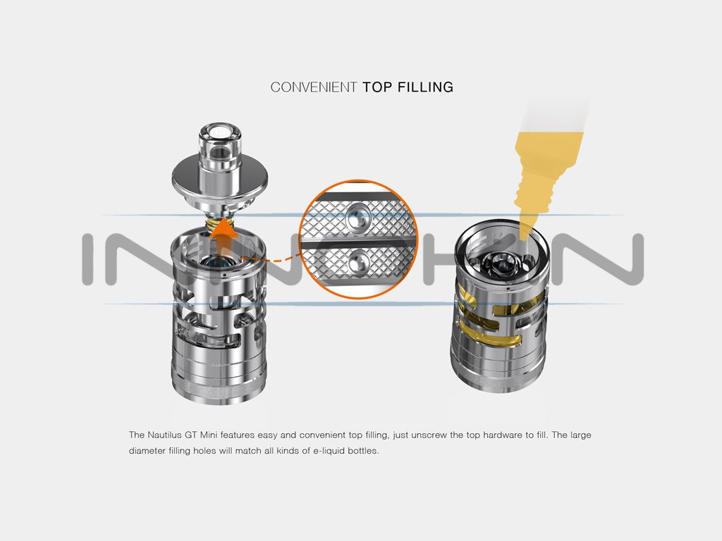aSpire Nautilus GT Mini osloví především příznivce klasického MTL šlukování. Je postaven na kvalitní základně z ušlechtilé oceli, která je doplněna o kvalitní pyrexové sklo. Celkový objem pro náplň tak činí až 2,8 ml zásobního prostoru. Nastavitelný přívod vzduchu (Airlow) je samozřejmostí, a to v dokonalém provedení, které je přesně odstupňované celkem pěti různě velikými průchody. Průchod vzduchu může být také celkově uzavřen. Díky tomu to provedení je Nautilus GT Mini primárně určen pro klasický styl potahování MTL, jaký známe u klasických cigaret, nicméně v kombinaci se správně zvolenou žhavící hlavou a při plném otevření přívodu vzduchu lze snadno použít i pro přímý styl potahování do plic (DL). Vše završuje tolik oblíbený systém horního plnění, kdy stačí pootočit horní částí Clearomizeru a jednoduchým způsobem jí vytáhnout. K dispozici jsou dva dostatečně velké plnící otvory, kterými se plnění stane rychlou a jednoduchou záležitostí. K případné výměně žhavící hlavy stačí odšroubovat spodní základnu a samotné výměně už nic nebrání.