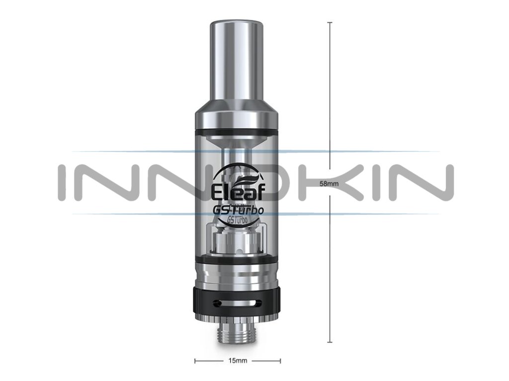 Nový a vylepšený clearomizér Eleaf GSTurbo spojuje kompaktní rozměry, stylový design a systém uzpůsobený zejména na klasické šlukování. Celé tělo je vyrobeno z kvalitní nerezové oceli a pyrexového skla. Ve vrchní části se nachází odnímatelný náustek typu 510, který lze snadno nahradit za libovolný náustek se stejným závitem dle vašich preferencí.