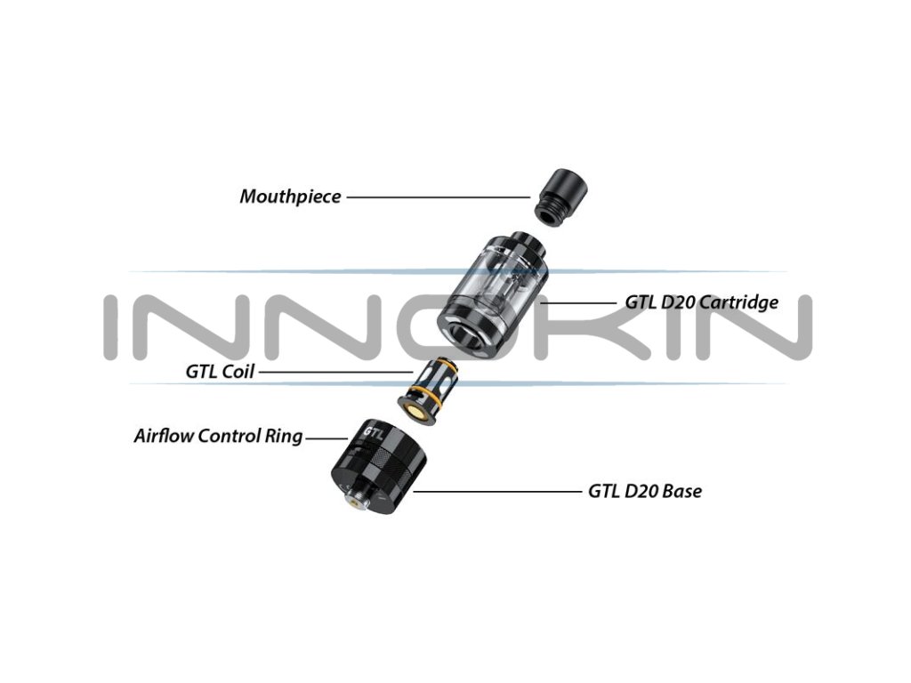 Ve spodní části clearomizéru se nachází praktický systém regulace airflow, otáčením regulačního kroužku si snadno a rychle nastavíte potřebnou tuhost potahu. V základní verzi se jedná o MTL clearomizér. Je totiž kompatibilní se žhavícími tělísky Eleaf GTL, přičemž v balení na vás čekají hned dvě tělíska z této série v černém provedení. Jedná se o tělíska s odpory 0,8 ohm a 1,2 ohm. Samostatně si pak můžete k modelu zakoupit také tělísko s odporem 0,4 ohm pro rozšíření funkčnosti na utaženější RDL vaping. Eleaf GTL D20 Tank se skvěle hodí zejména pro začátečníky a uživatele, kteří si chtějí vyzkoušet krásy MTL vapingu a poohlíží se po základním a jednoduchém clearomizéru.