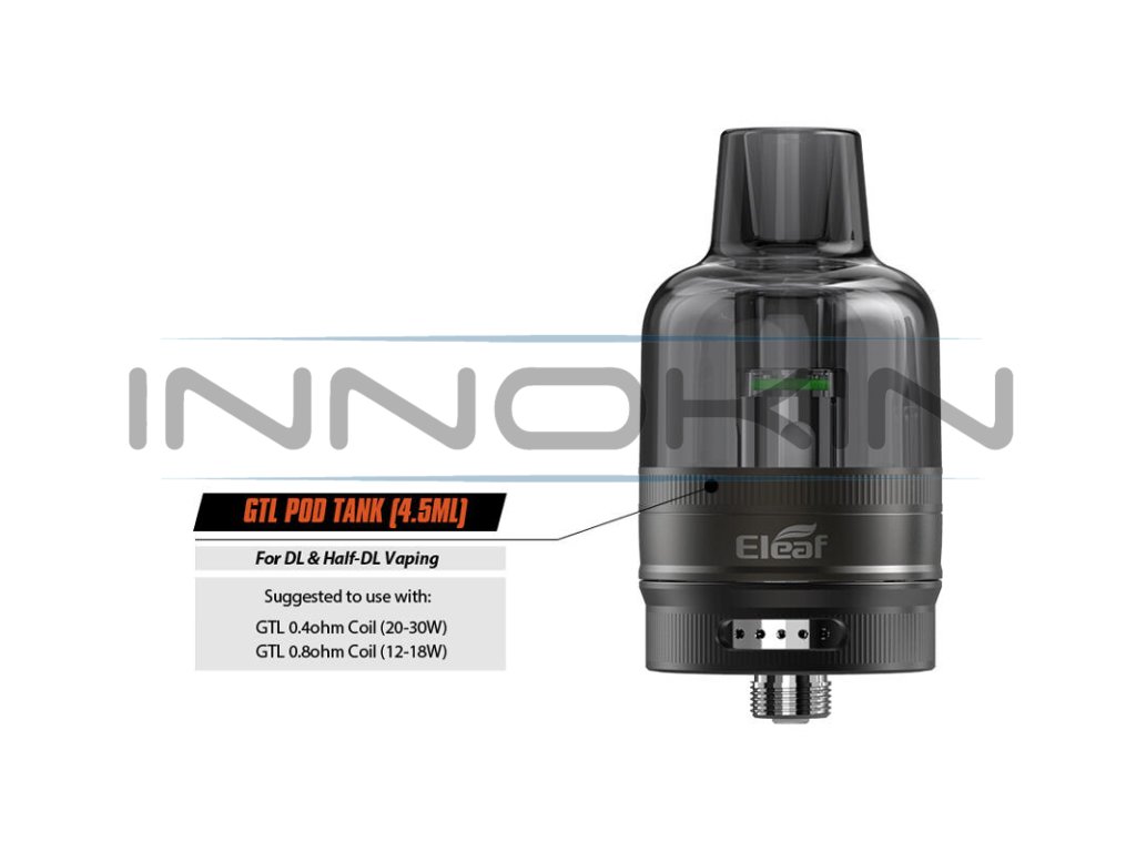 Upozornění: Clearomizér Eleaf GTL Pod Tank s objemem 4,5 ml je doporučeno používat se žhavícími tělísky Eleaf GTL s odpory 0,4 ohm a 0,8 ohm.