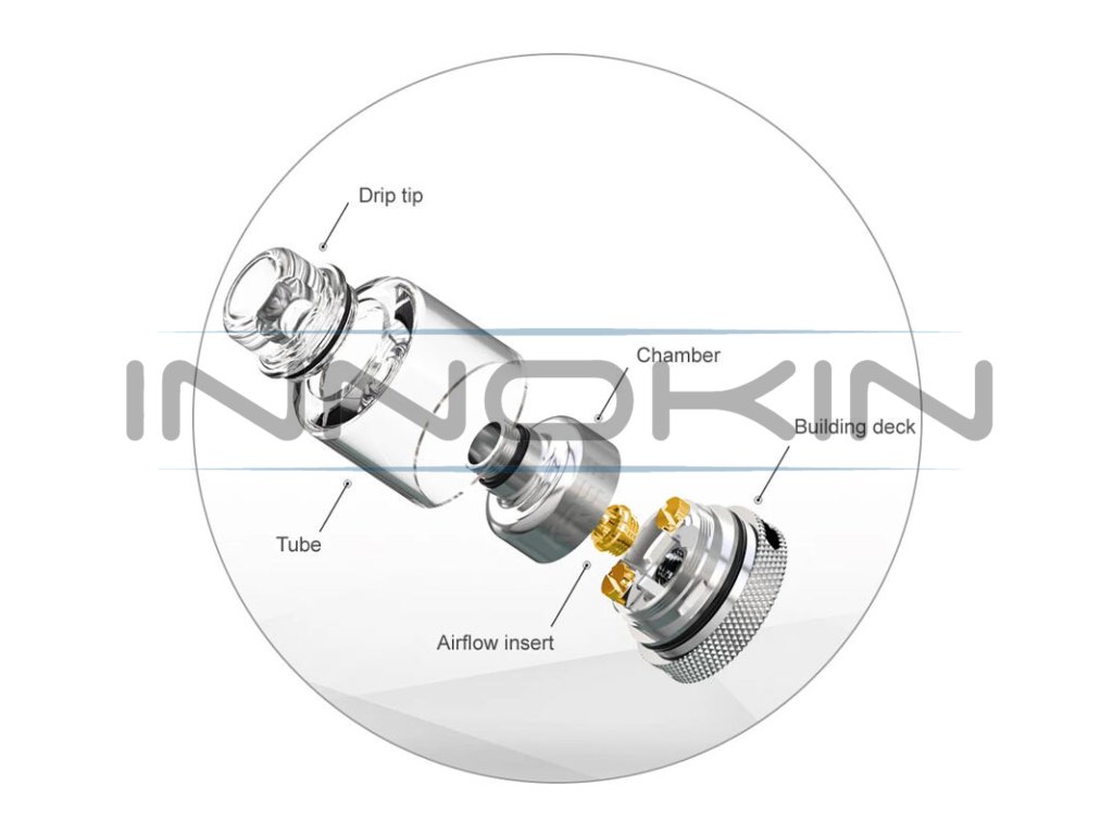 Ve spodní části se nachází neregulovatelný airflow systém, který doplňuje vnitřní vzduchová vložka. Ta se nachází přímo pod spirálkou a dá se dle potřeby měnit. V balení najdete čtyři vložky s různými průměry pro různou produkci páry. Všechny vložky nabídnou širší průměr, atomizér se zaměřuje na uživatele přímého potahování do plic (DL).
