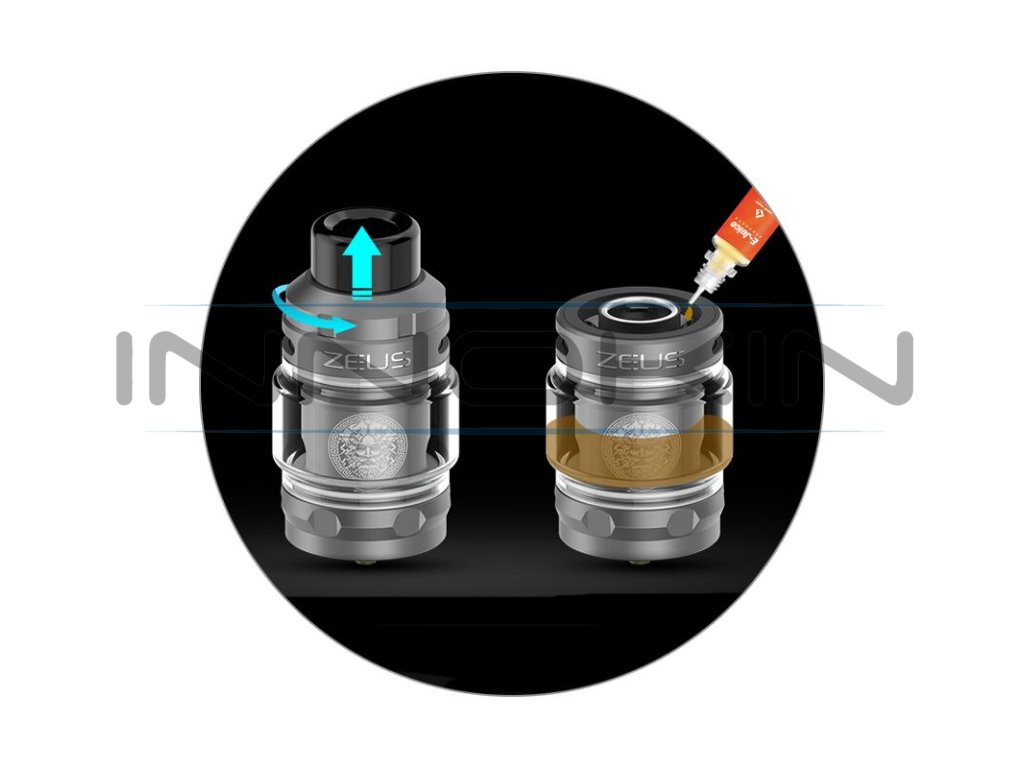 Samotný tank nabídne díky přítomnosti vybouleného skla velký objem. Ten činí v základní verzi až 5 ml. Do atomizéru tak dostanete skutečně velké množství e-liquidu. Zároveň takto velký tank zajistí dlouhé hodiny nerušeného vapování bez nutnosti dalšího plnění. V základním balení se potom nachází také standardní pyrexové tělo, po jehož osazení získáte objem 3,5 ml. Pokud vám však e-liquid v tanku přeci jen dojde, rozhodně nezoufejte. Atomizér je vybaven jednoduchým systémem vrchního plnění. Pouze pootočíte vrchním uzávěrem a tento uzávěr následně odejmete. Poté už můžete začít plnit. Do plné kapacity doplníte během několika vteřin. Jednou z hlavních výsad atomizéru Zeus Subohm je potom přítomnost vrchního systému airflow, který eliminuje možné vyprskávání a protékání e-liquidu spodními airflow otvory. Díky umístění airflow systému ve vrchní části získáte také věrnější podání chuti na základě efektivnější cirkulace vzduchu uvnitř atomizéru.