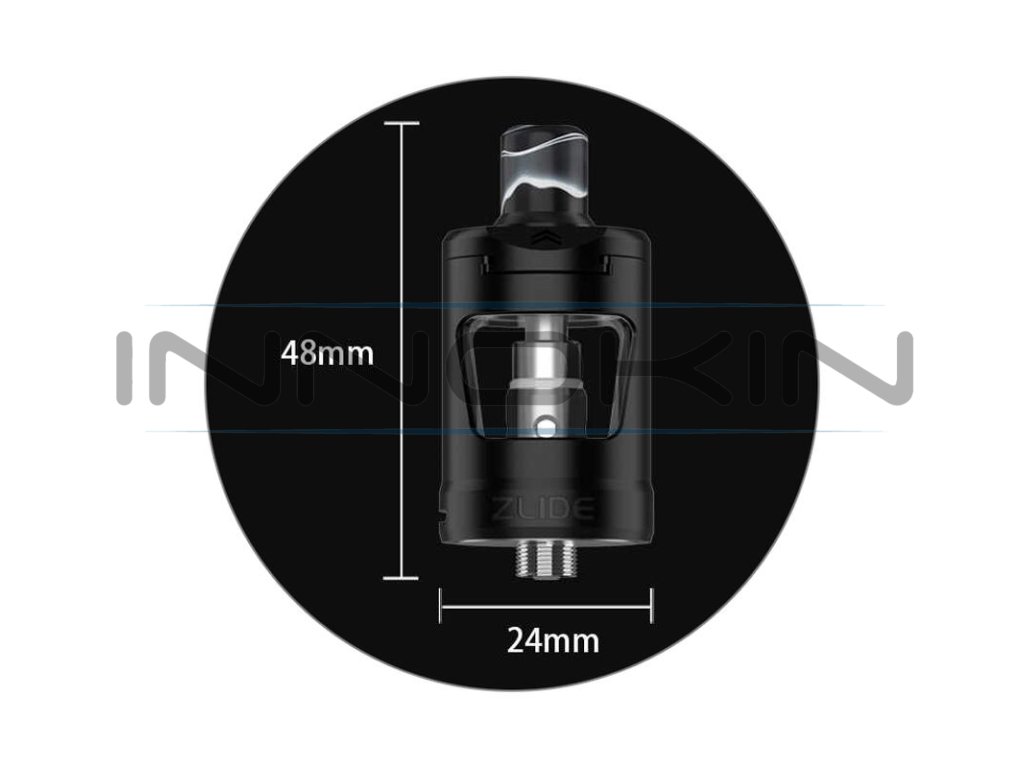 Innokin Zlide Tank je elegantně zpracovaný atomizér vhodný pro začínající vapery a nenáročné uživatele. Nabídne celokovovou konstrukci a provoz na tovární žhavící hlavy ze série Z-Coil. K dispozici je široká nabídka žhavících hlav se zaměřením hlavně na klasické šlukování, samostatně se však dají dokoupit také hlavy pro DL vapování. Délka atomizéru činí jen 48 mm a průměr se zastavil na 24 mm. Ve spodní části se nachází závit typu 510, díky čemuž je atomizér kompatibilní s drtivou většinou modů na dnešním trhu. O přísun vzduchu do atomizéru se postará spodní regulovatelný systém airflow.
