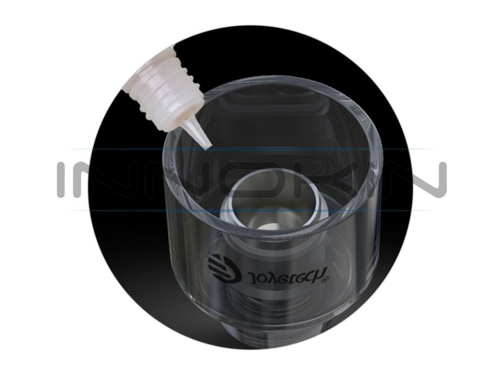 Novinkou je systém plnění e-liquidu. Jelikož se jedná o clearomizér, jehož vrchní část se skládá pouze z jednoho dílu, je zapotřebí plnit e-liquid spodem. Odšroubujte spodní základnu, otočte celé skleněné tělo vzhůru nohama a naplňte ho e-liquidem. Poté jen zašroubujte zpět základnu a žhavící hlavu a můžete začít vapovat. Do tanku lze doplnit e-liquid až do kapacity 2 ml. Ve spojení s touto příjemnou kapacitou tanku a stylovým designem se jedná o jeden z nejkrásnějších atomizérů na trhu.
