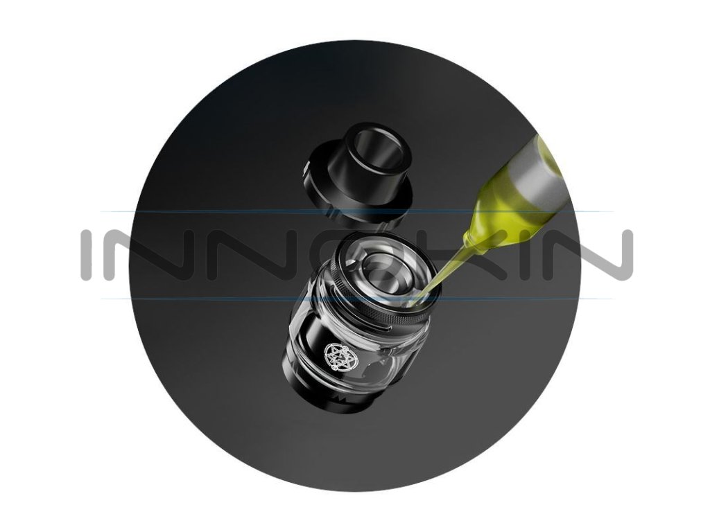 Atomizér se pyšní inovativním a praktickým uzávěrem pro plnění liquidu. Vrchní část disponuje utěsněným bajonetovým systémem, který stačí pootočit o čtvrt otáčky a sejmout z těla atomizéru. Odkryje se tak před vámi velkorysý plnící otvor, díky kterému během chvilky znovu doplníte plnou kapacitu tanku vaším oblíbeným liquidem i z větších typů lahviček.