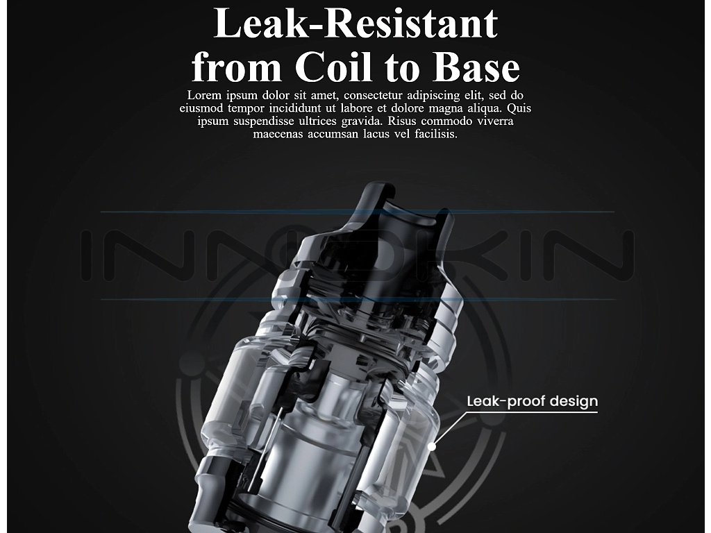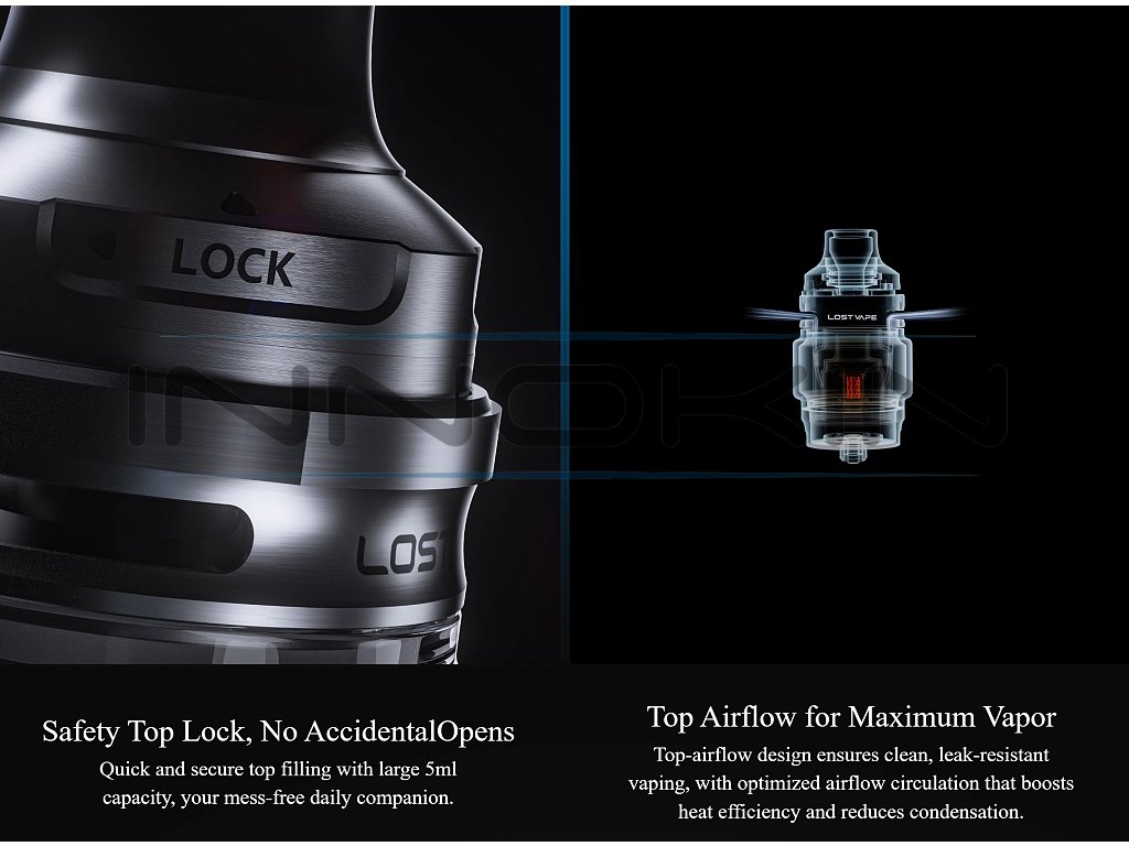 Regulace AirflowHorní airflow systém s dvěma protilehlými širokými otvory umožňuje plynulou a tichou cirkulaci vzduchu přímo k žhavící hlavě. Regulační kroužek poskytuje intuitivní ovládání intenzity potahu od částečně uzavřeného až po plně otevřený airflow, což vám umožní přizpůsobit vapování vašim aktuálním preferencím. Díky hornímu umístění je systém dokonale chráněn proti úniku e-liquidu do vzduchotechniky. |