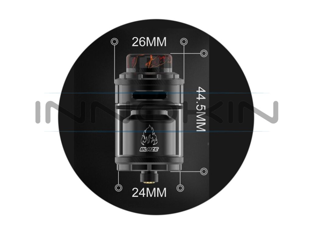 Světoznámý výrobce vaperského hardwaru Thunderhead Creations spojil síly s americkým recenzentem Mike Vapes a společnými silami dali dohromady prvotřídní motací RTA atomizér pro přímé potahování do plic s řadou inovativních prvků a skvělých funkcí pro každodenní vaping. Clearomizér THC Blaze RTA zaujme zejména svým robustním dílenským zpracováním, ale také nesmírně detailním a promyšleným airflow systémem pro zisk maximálního množství plné a prokreslené chuti během vapování. Tělo atomizéru je vyrobeno z vysoce kvalitní nerezové oceli a borosilikátového skla tanku. Délka atomizéru činí 44,5 mm bez náustku a závitu, průměr se potom zastavil na 26 mm ve vrchní části a na 24 mm v části u základny. Spodní část atomizéru je opatřena standardním závitem typu 510, díky čemuž je kompatibilní s drtivou většinou modů na trhu.