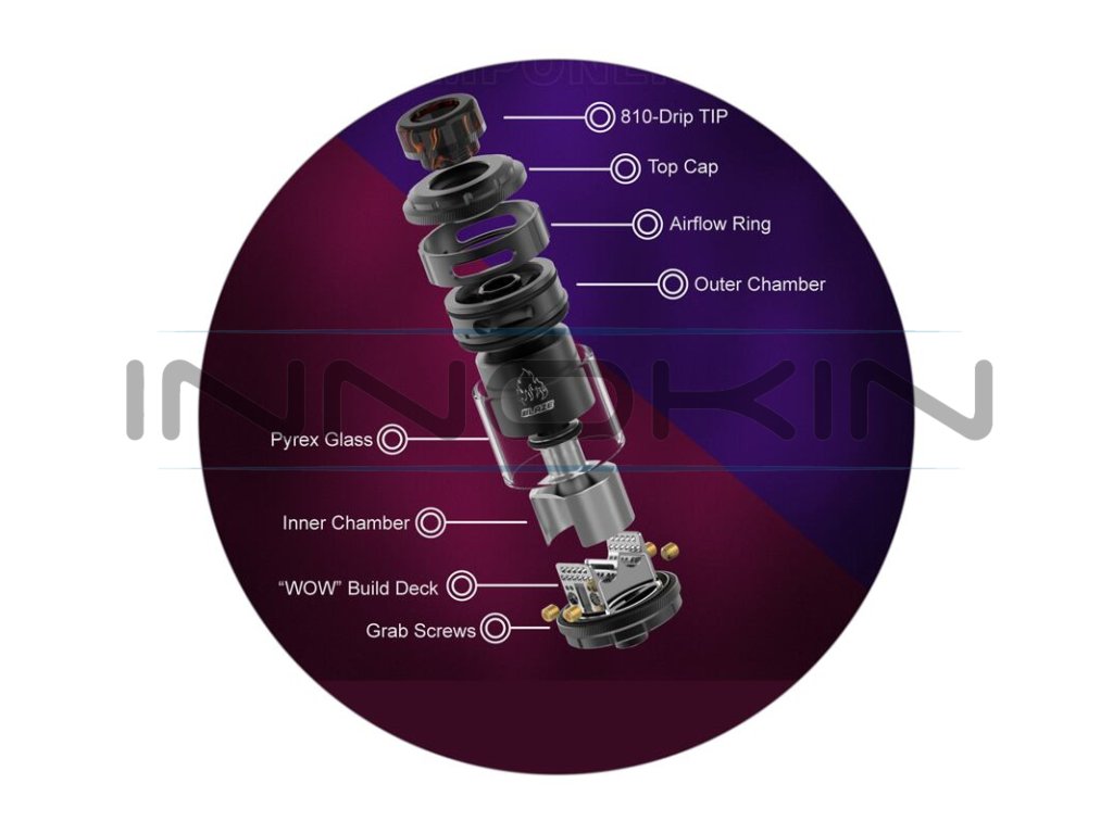 Hlavní předností atomizéru THC Blaze RTA je inovativní "WOW" základna, která umožňuje pohodlné a rychlé osazení dvěma spirálkami dle vlastního výběru. Základna nabídne dostatek prostoru také pro větší spirálky a disponuje potřebným místem pro jednoduchou montáž. S instalací si budou rozumět naprosto všichni příznivci DIY vapingu. Díky specifické konstrukci základny se můžete také těšit na prvotřídní podání chuti.