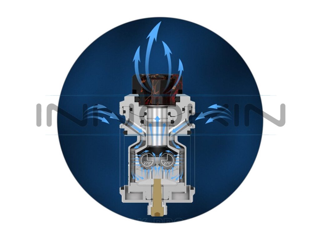Poté, co vzduch vstoupí do atomizéru skrz vrchní airflow systém, proudí směrem k základně. Do základny je přiváděn ze spodní části, odkud také ofukuje samotné spirálky. Revoluční systém 270° Honeycomb, kterým je opatřena samotná základna, je skutečně dechberoucí. Atomizér si naprosto hravě poradí s kterýmkoliv e-liquidem. Ať už preferujete jednosložkové náplně, nebo složité a komplexní ovocné a dezertové směsi, všechny chutě vykreslí naprosto dokonale.