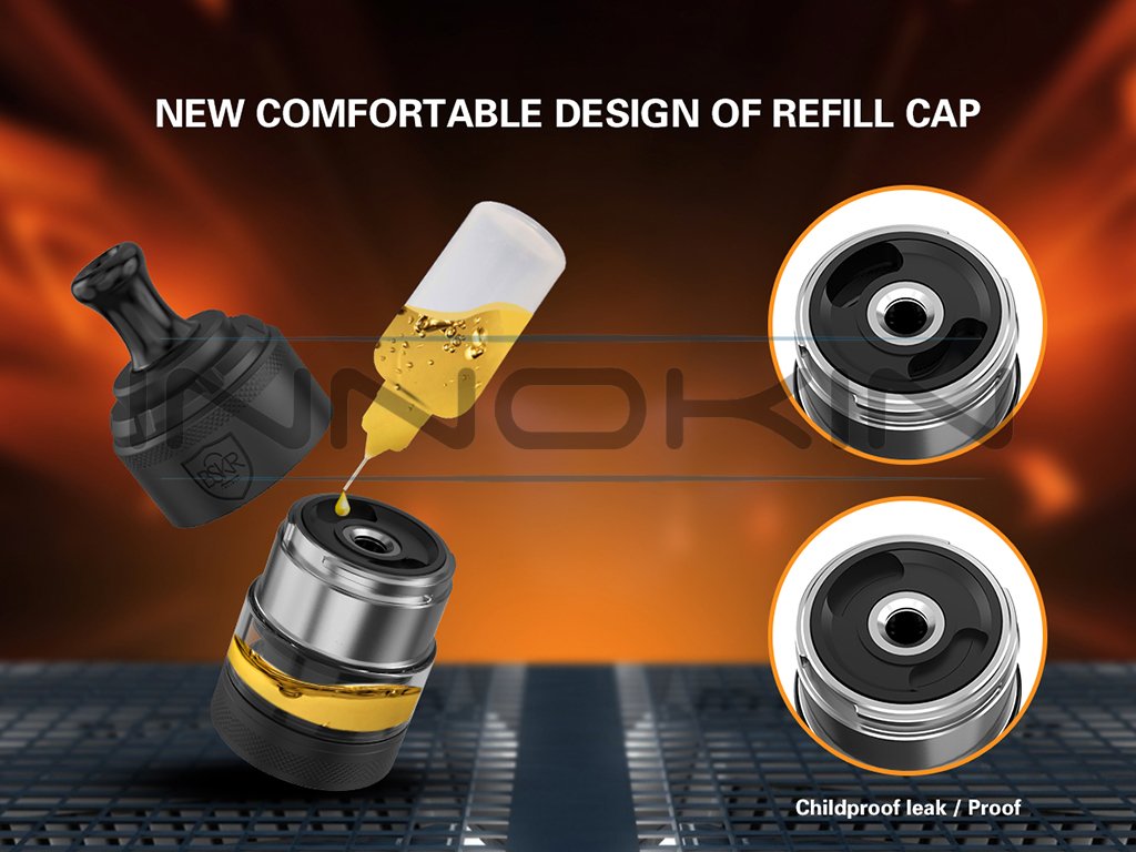 Jednoduché plnění Plnění je také velmi praktické a jednoduché a probíhá pootočením (po směru hodinových ručiček) a sejmutím horní části Clearomizeru, pod kterou se nachází dva dostatečně velké otvory pro plnění, opatřené navíc membránou, která slouží nejen jako opatření proti nenechavým dětem, ale taky jako zpětná záklopka pro nechtěné protékání liquidu do meziprostoru tanku a sacímu drip tipu. |