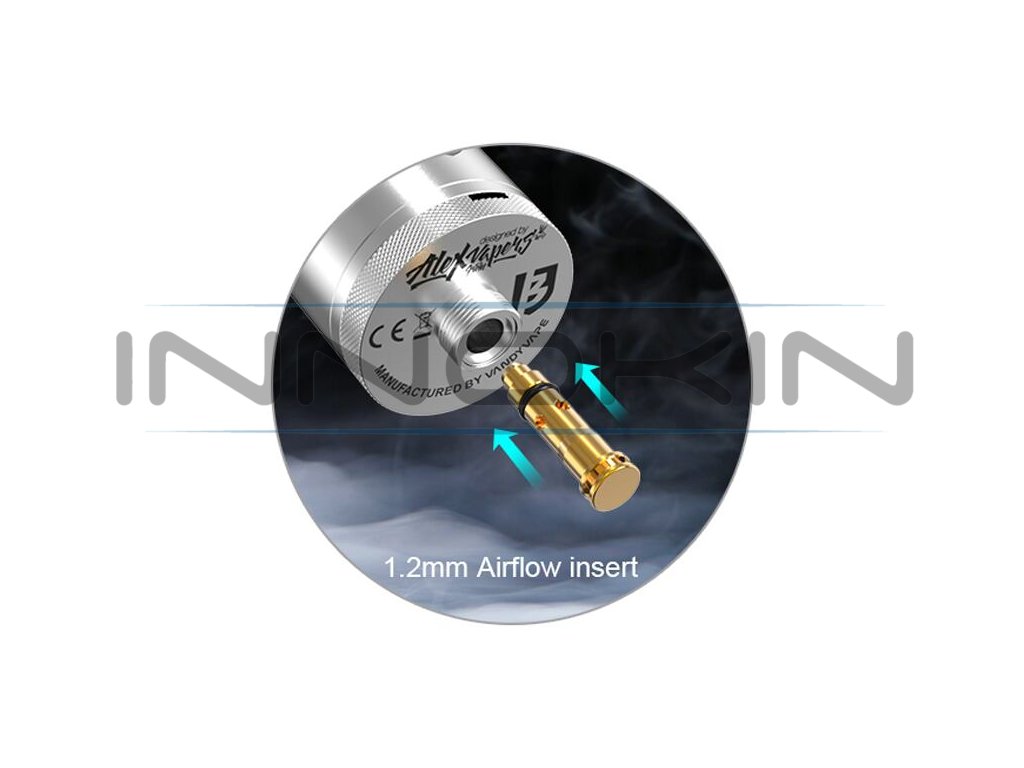 Atomizér Vandy Vape BSKR Mini V3 nabídne inovativní metodu regulace přívodu vzduchu. Otvor pro přísun vzduchu ke spirálce je umístěn přímo v centrpinu, který je odnímatelný. Jednoduše ho tak můžete vyšroubovat a nasadit jiný centrpin s jiným průměrem vzduchového otvoru. V základní konfiguraci je atomizér osazen centrpinem se vzduchovým otvorem 1,2 mm, v balení na vás potom čekají čtyři další centrpiny s průměry vzduchu 0,8 mm, 1,0 mm, 1,6 mm a 2,0 mm.