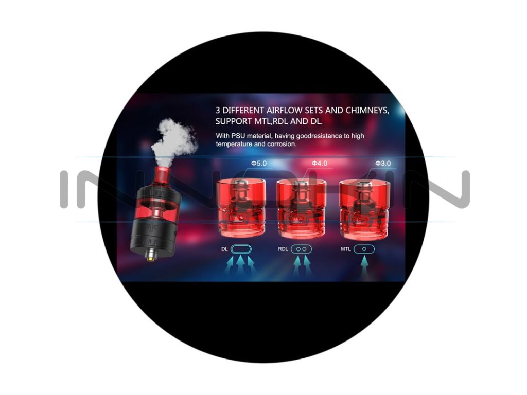 Všechny formy vapingu v jednom jediném těle. To nabízí Vandy Vape Requiem RTA. Součástí balení jsou tři komory s rozdílnými vzduchovými otvory a odlišnými průměry středového komínu pro možnost využití hned na tři různé formy vapování, tedy na MTL, DL a RDL vaping. Pro DL je připravena komora se širokým airflow a středovým komínem 5 mm, pro MTL je určena komora s úzkým průměrem airflow a průměrem komínu 3 mm a pro RDL vaping se můžete těšit na dva menší airflow otvory a průměr 4 mm.