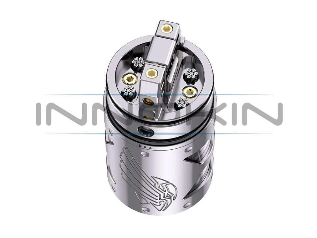 Do velké základny ve vrchní části můžete instalovat jednu, nebo dvě spirálky dle potřeby. Clearomizér podporuje obě dvě varianty buildu, v případě osazení jednou spirálkou vložíte místo druhé spirálky praktickou záslepku. Instalace je nesmírně snadná a rychlá. O co nejlepší podání chuti se postará speciální airflow systém 360°. Otvory pro přísun vzduchu se nachází přímo v úrovni spirálek a zaručí plynulou cirkulaci vzduchu uvnitř atomizéru. Přímo u základny se pak nachází ještě praktická airflow vložka, v balení na vás čekají hned dva druhy, které zprostředkují unikátní požitek z vapingu. E-liquid je k základně z tanku přiváděn pomocí ocelových drátů, které můžete znát již z původní verze Brunhilde. Nově zde najdete celkem šest slotů pro umístění šesti drátů, můžete však použít také jen čtyři dráty a zbylé dva otvory zaslepit. Možnosti jsou skutečně rozsáhlé. Vapefly Brunhilde 1o3 RTA je špičkový DL motací atomizér, který vás ohromí už po prvních minutách používání.