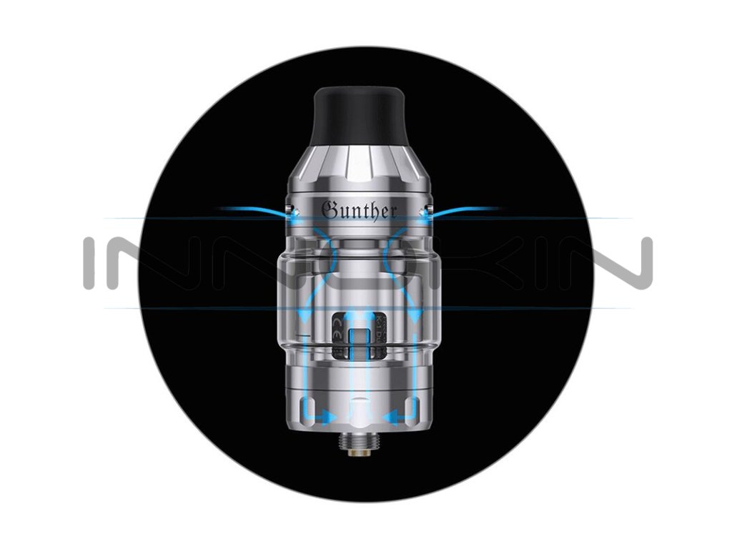Výrobce umístil u atomizéru Gunther airflow systém do vrchní části. Díky tomu je zajištěna plynulejší cirkulace vzduchu uvnitř clearomizéru a výsledná chuť e-liquidu je potom ještě o poznání vyšší, než u atomizérů se spodním airflow systémem. Další nespornou výhodou vrchního airflow je absence možného vytečené e-liquidu v případě ucpání žhavícího tělíska.