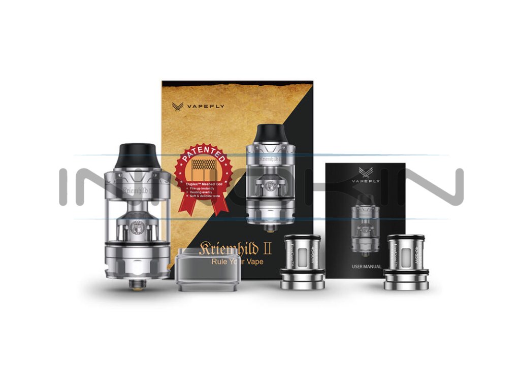 Kriemhild II Sub Ohm Tank od výrobce Vapefly je nízkoodporový clearomizér na tovární žhavící hlavy vhodný pro přímé potahování do plic. Láká na stylové designové zpracování, velký objem tanku a zbrusu nové žhavící hlavy s mesh pletivem pro zisk velkého množství páry a prvotřídní chuť. Délka atomizéru činí jen 51,2 mm. Průměr se zastavil na 25 mm. Kompatibilitu s většinou modů na trhu zajišťuje závit typu 510 ve spodní části. Vrchní část je opatřena náustkem s uchycením typu 810, v balení najdete také adaptér pro použití náustku s uchycením 510. Objem tanku činí 4 ml, přičemž tuto kapacitu pohodlně navýšíte až na 5 ml osazením vybouleného pyrexového skla z balení. Samozřejmostí je potom intuitivní bajonetové vrchní plnění pro co nejsnazší obsluhu.