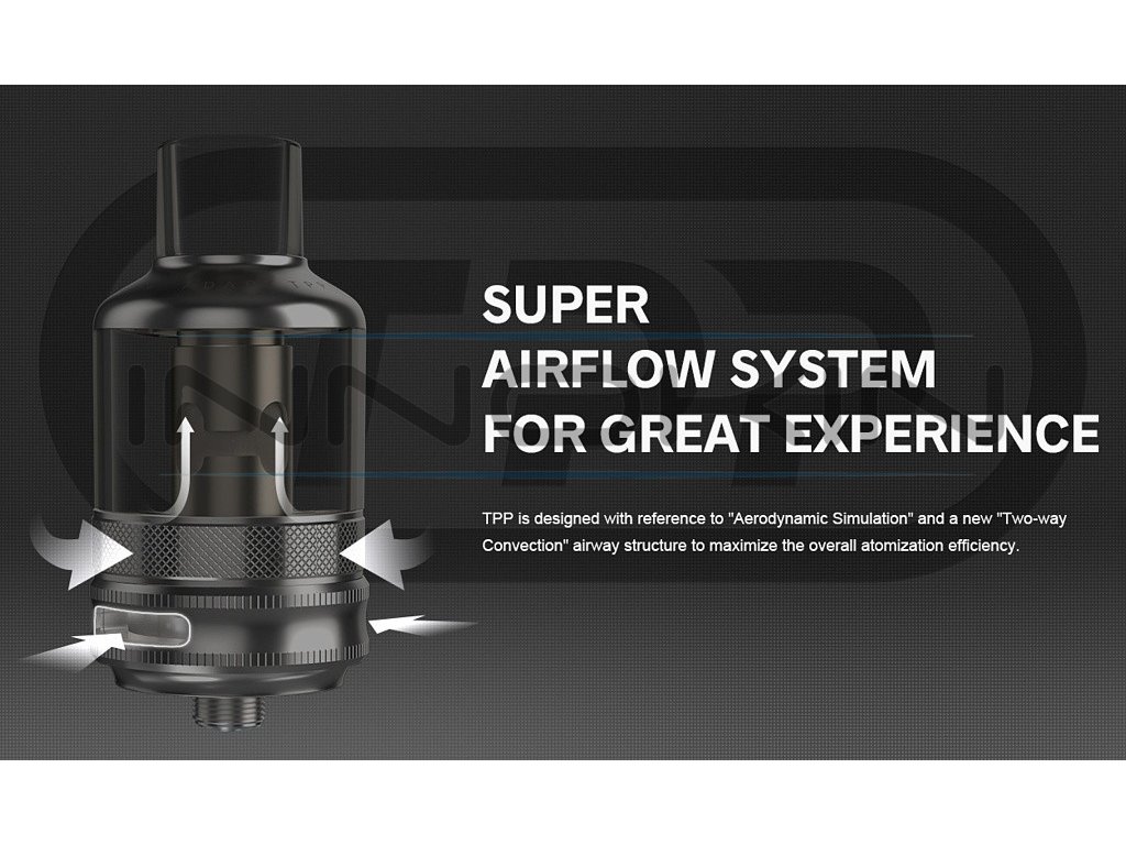 Špičkový propracovaný Pod Clearomizer o objemu 5,5ml a vyměnitelnou Pod cartridgí TPP s podporou stejnojmenných žhavících hlav Voopoo TPP, plně kompatibilní s Cartridgemi Voopoo Pnp, závit 510, Regulovatelné Airflow, vhodný pro DL styl vapování. 2x žhavící hlava Voopoo TPP DM1 0,15ohm a DM2 0,2ohm v SETU. Vyměnitelný náustek (Drip Tip) 810.