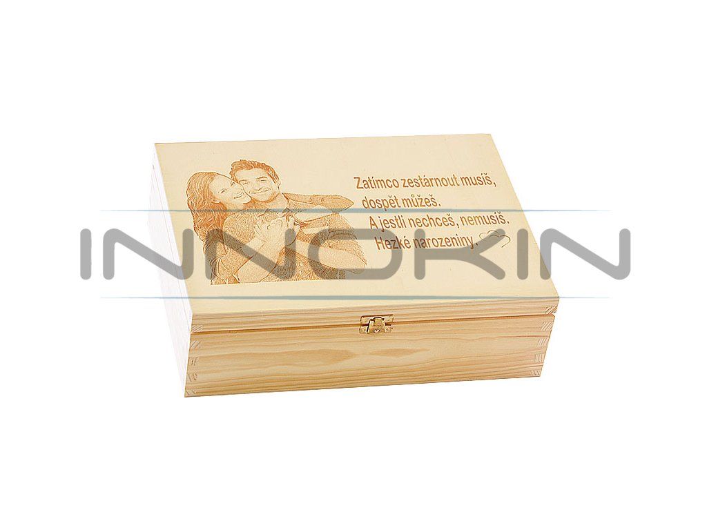 Originální dárková truhla nabízí možnost jedinečným způsobem vyjádřit úctu a poděkování Vašim blízkým a firemním partnerům. Dárková truhla poskytuje jedinečný prostor pro blahopřání, vzkaz, firemní logo, či obrázek. Buďte kreativní a připravte obdarovanému jedinečné překvapení. Vytvořte originál, který nemá nikdo jiný na světě! Prostě parádní kousek. Vaše nápady rádi laserem vygravírujeme na víko poctivého boxu zhotoveného z borovicového dřeva a překližky, nebo vytiskneme a umístíme na vnitřní stranu víka.