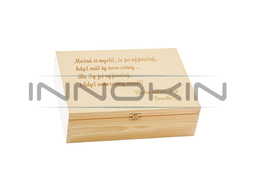 Originální dárková truhla nabízí možnost jedinečným způsobem vyjádřit úctu a poděkování Vašim blízkým a firemním partnerům. Dárková truhla poskytuje jedinečný prostor pro blahopřání, vzkaz, firemní logo, či obrázek. Buďte kreativní a připravte obdarovanému jedinečné překvapení. Vytvořte originál, který nemá nikdo jiný na světě! Prostě parádní kousek. Vaše nápady rádi laserem vygravírujeme na víko poctivého boxu zhotoveného z borovicového dřeva a překližky, nebo vytiskneme a umístíme na vnitřní stranu víka.