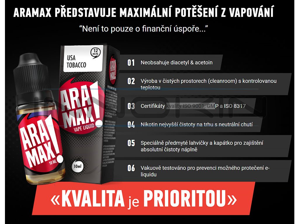 Aramax patří mezi významné výrobce e-cigaret a vynikajících příchutí. Aramax má i vlastní elektronické cigarety. Aramax cigarety jsou vyráběny pro snadné použití za přijatelné ceny. Aramax přináší kvalitu, jednoduchost a eleganci. Aramax má velmi rozmanitou nabídku příchutí. Aramax má čistou a věrnou chuť. Aramax má také vysoce kvalitní výrobu.