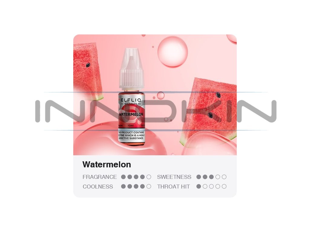 Osvěžující a lahodná chuť vodního melounu... Společnost Elf Bar je ve světě vapingu opravdovým fenoménem dnešní doby. Jejich jednorázové elektronické cigarety si našly miliony příznivců po celém světě, a to díky jejich nezapomenutelné a jedinečné chuti liquidu. Nyní si pro svoje fanoušky Elf Bar přichystal i samotný liquid ELFLIQ Nic SALT, který se od běžných liquidů odlišují tím, že má nižší PH a obsahuje nikotinovou sůl, díky které dochází k rychlejší a kvalitnější vstřebatelnosti = bez dráždivého pocitu v krku oproti klasickým liquidům. Vyvážený poměr 50VG/50PG je vhodný do všech typů elektronických cigaret.