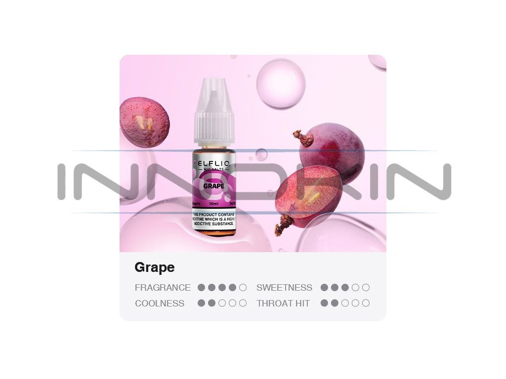 Chuť čerstvých hroznů se sladkokyselou dochutí... Společnost Elf Bar je ve světě vapingu opravdovým fenoménem dnešní doby. Jejich jednorázové elektronické cigarety si našly miliony příznivců po celém světě, a to díky jejich nezapomenutelné a jedinečné chuti liquidu. Nyní si pro svoje fanoušky Elf Bar přichystal i samotný liquid ELFLIQ Nic SALT, který se od běžných liquidů odlišují tím, že má nižší PH a obsahuje nikotinovou sůl, díky které dochází k rychlejší a kvalitnější vstřebatelnosti = bez dráždivého pocitu v krku oproti klasickým liquidům. Vyvážený poměr 50VG/50PG je vhodný do všech typů elektronických cigaret.