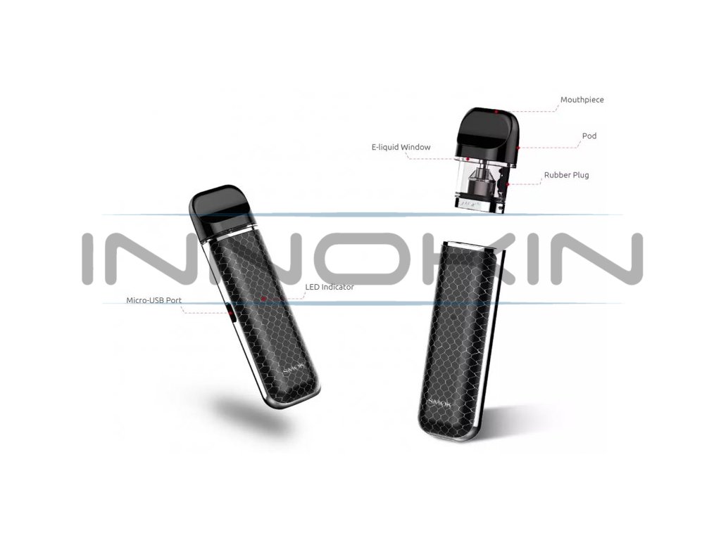 Smoktech představuje novou elektronickou cigaretu s POD systémem a krásným designovým zpracování ve stylu Cobry. Vyměnitelná cartridge (POD) s žhavicí hlavou pojme až 2ml liquidu. Jednoduchým zacvaknutím propojíte cartridge s tělem baterie, které ukrývá vestavěnou baterii o kapacitě 450mAh s automatickým spínačem a LED indikátorem stavu nabití. Nabíjení zajišťuje micro USB vstup. Novo disponuje osmivteřinovou kontrolou potahů, ochranou proti zkratu, přehřátí a vybití. Díky svým proporcím se stane nedílnou součástí Vašich kuřáckých potřeb. Více info v detailním popisu