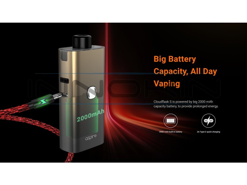 Cloudflask S je vylepšením revolučního sub-ohmového pod systému Aspire Cloudflask. Jednoduchý a snadno použitelný pod systém s vyměnitelnými žhavícími hlavami, který je navržen tak, aby produkoval ještě více páry. Cloudflask S disponuje integrovanou interní baterií s kapacitou 2000 mAh. Tato vysoká kapacita zaručuje bezproblémové celodenní vapování. Objem Pod cartridge 2ml, rychlé USB-C nabíjení, LED indikace stavu nabití. Bezpečnostní ochrana čipové sady Aspire ASP, 2x žhavící hlava v SETU. Tato cigareta je vhodná pro DL vapování.