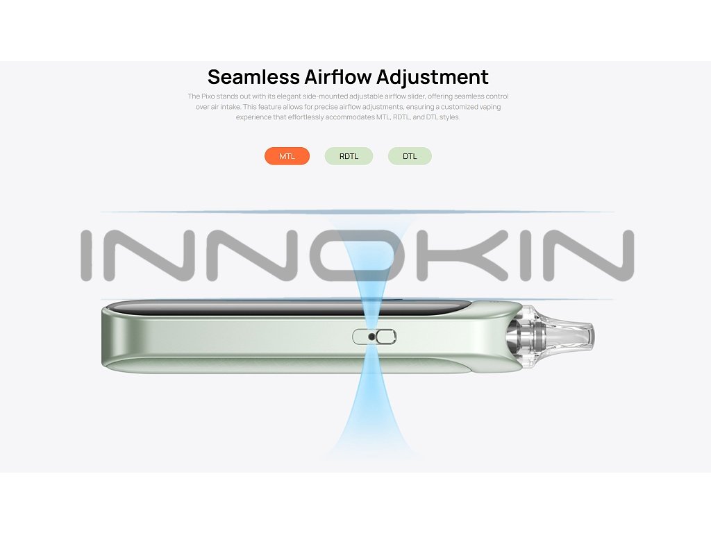 Přívod vzduchu, AirflowNastavitelná regulace přívodu vzduchu na boku zařízení nabízí tři možné pozice pro dokonalé přizpůsobení vašemu stylu vapování. Ať už preferujete utaženější tah pro MTL styl nebo volnější pro RDL, airflow regulace vám umožní najít ideální nastavení. |