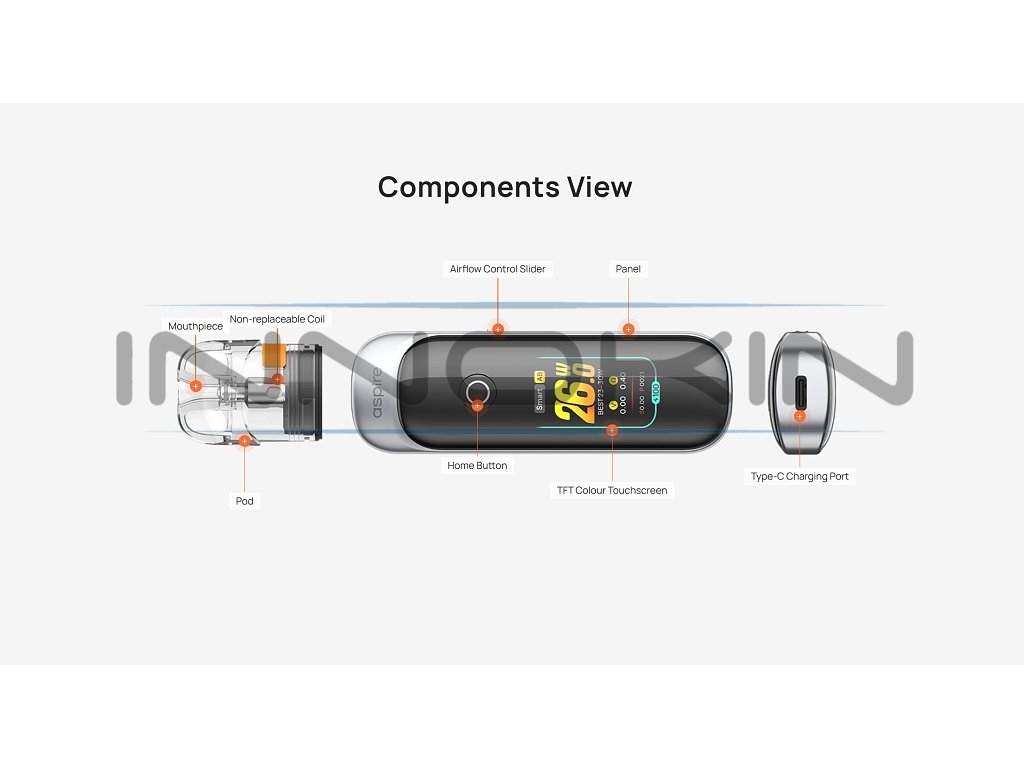 Parametry a specifikaceRozměry: 30.4 x 111.4 x 16.6 mm Kapacita baterie: 1100 mAh Režimy: Smart / Watt Metody spínání potahu: automatické/manuální Výstupní výkon: 5 - 30 W Způsob nabíjení: USB-C port (5V / 2A) Regulace výkonu: ano Objem Pod Cartridge: 2 ml Styl potahování: MTL / RDL Odpor žhavících hlav v balení: 0.4Ω / 1.0Ω Regulace přívodu vzduchu (Airflow): ano Hmotnost: 74 g Barva: Black (Černá) Materiál: zinková slitina/plast |