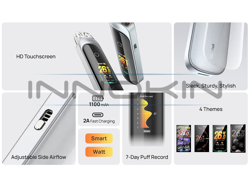 Objevte novou generaci elektronických cigaret s Aspire Pixo Pod, které získalaly prestižní ocenění nejlepšího POD zařízení na VAPEXPO v Paříži. Tato pokročilá elektronická cigareta spojuje elegantní moderní design s výjimečnou funkcionalitou a intuitivním ovládáním. Pixo Pod je vybavena velkým 1.47" TFT dotykovým displejem s grafickým rozhraním, které si můžete plně přizpůsobit podle svých preferencí. Zařízení disponuje výkonnou baterií 1100 mAh zajišťující při běžném používání až čtyři dny vapování a rychlým USB-C nabíjením 2A. Díky své univerzálnosti umožňuje různé styly vapování MTL i RDL podle zvolené Pod Cartridge s vestavnou žhavící hlavou s odporem 0,4Ω nebo 1,0Ω. Maximální výkon 30W můžete nastavit buď automaticky pomocí inteligentního Smart režimu, nebo manuálně v režimu Watts. Regulace přívodu vzduchu nabízí tři možné nastavení pro dokonalé přizpůsobení vašim preferencím.