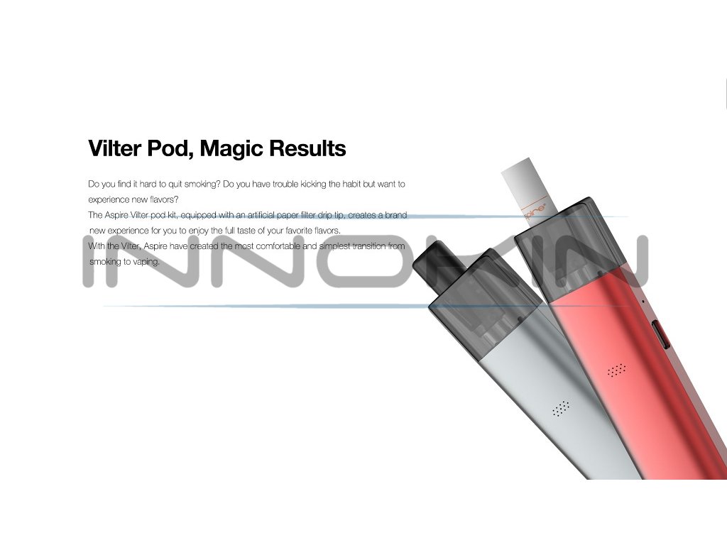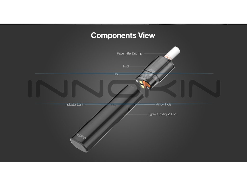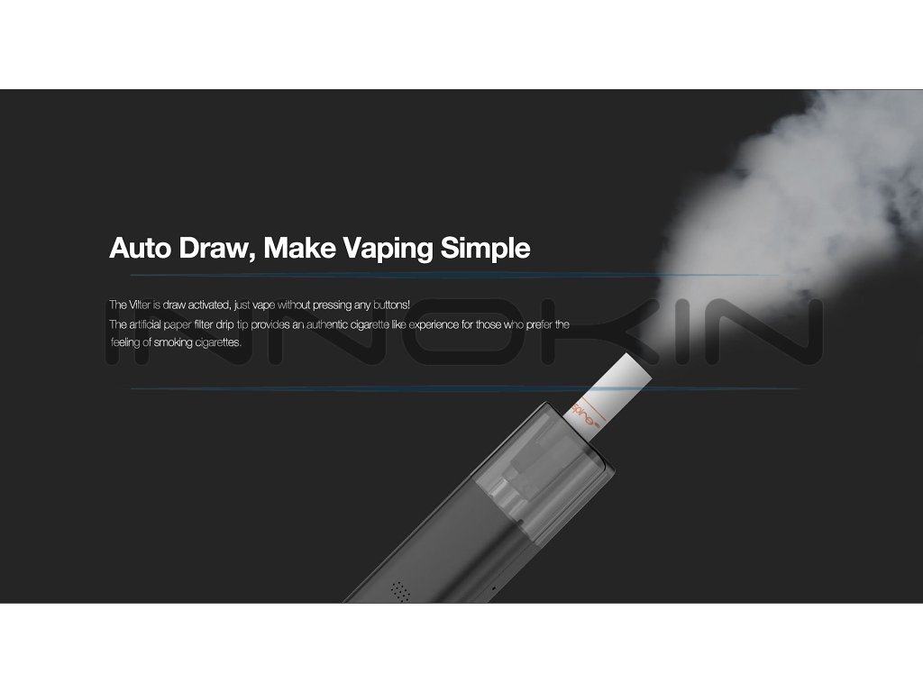 Unikátní automatická Pod elektronická cigareta s možností použití jak klasického Delrinového náustku, tak speciálních umělých papírových filtrů, které dokonale simulují potah jako u klasické cigarety. Vestavná baterie s kapacitou 450mAh, Pod cartridge o objemu 2ml se zabudovanou žhavící hlavou s mesh spirálkou s odporem 1,0ohm. Automatická aktivace potahu, USB-C nabíjení. Rozměry: 107,2mm x 22mm x 12,5mm.