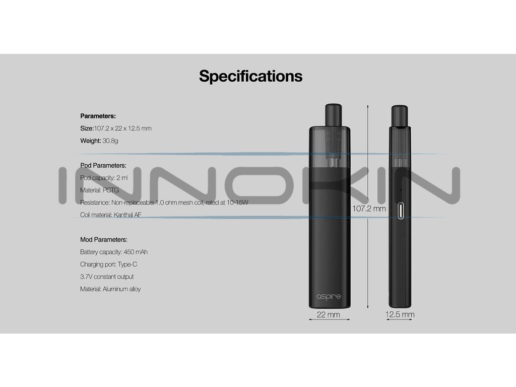 Unikátní automatická Pod elektronická cigareta s možností použití jak klasického Delrinového náustku, tak speciálních umělých papírových filtrů, které dokonale simulují potah jako u klasické cigarety. Vestavná baterie s kapacitou 450mAh, Pod cartridge o objemu 2ml se zabudovanou žhavící hlavou s mesh spirálkou s odporem 1,0ohm. Automatická aktivace potahu, USB-C nabíjení. Rozměry: 107,2mm x 22mm x 12,5mm.