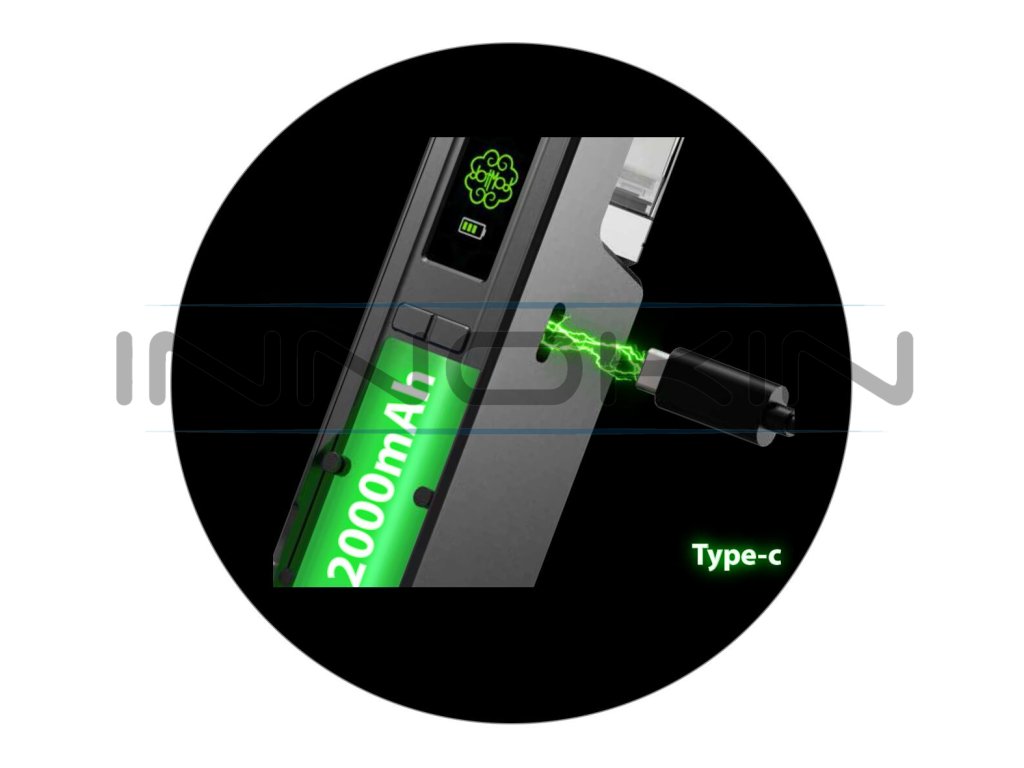 Jádro zařízení ukrývá integrovanou baterii se strhující kapacitou 2000mAh pro efektivní využití na všechny typy vapování a pro dlouhou výdrž na jedno nabití. Příjemným prvkem je také přítomnost moderního USB-C nabíjení s podporou dobíjecího proudu až 2A.