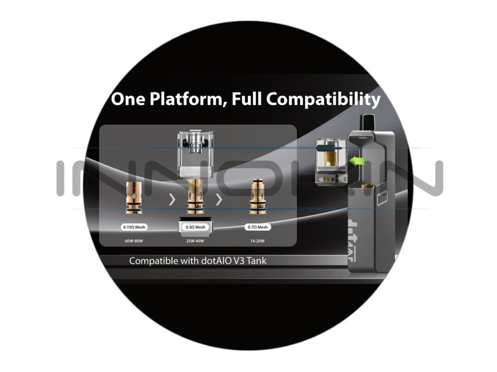 Zařízení je kompatibilní s platformou žhavících hlav Dotmod dotCoil, přičemž rovnou v základním balení najdete hlavu s odporem 0,3ohm pro DL a RDL potah a hlavu s odporem 0,7ohm pro MTL vapování. Samostatně si můžete pořídit také hlavu s odporem 0,15ohm pro výraznější produkci páry a práci s vyšším výstupním výkonem.
