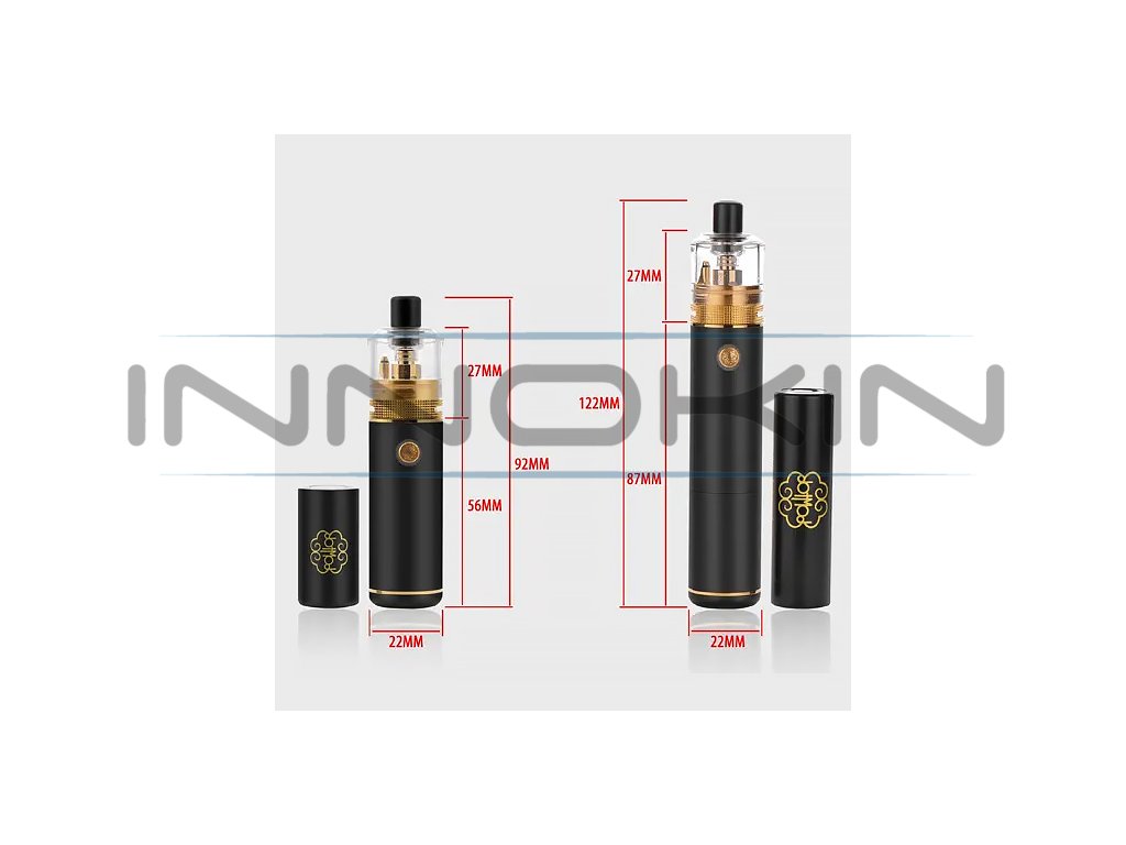 Rozměry Dotmod DotStick jsou velice kompaktní a s průměrem 22 mm a délkou 91 mm se jistě pohodlně vejde do každé kapsy. S použitím baterie typu 18650 se její délka díky nástavci prodlužuje, ale i tak jde o solidních 121 mm. K ovládání celé cigarety slouží pouze jedno hlavní tlačítko, které se svým zlatým provedením dominuje boční straně elektronické cigarety. Toto tlačítko slouží nejen k vypínání a zapínání cigarety, ale také k samotnému žhavení a nastavení změny výkonu.