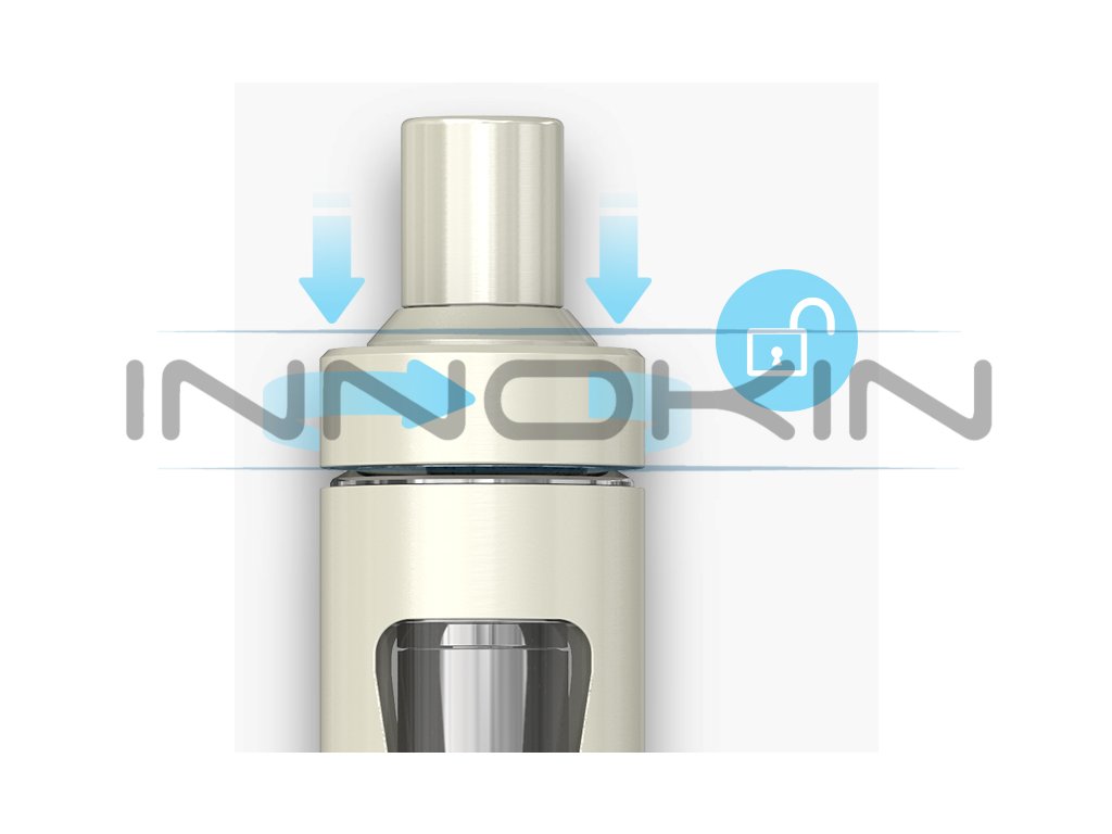 Dětská pojistka Vrchní odnímatelná část je opatřena dětskou pojistkou (ochrana před nechtěnému otevření). Atomizér (žhavící hlava) již není ve spodní části, jako u většiny ostatních clearomizerů, ale nachází se přímo pod náustkem, kde je i regulace přívodu vzduchu (Airflow) |