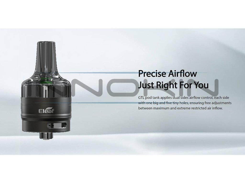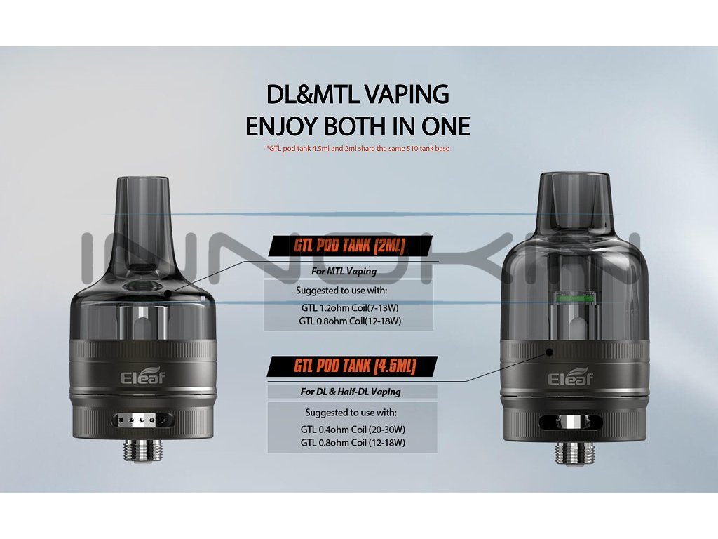Výkonná elektronická cigareta s kapacitou baterie 3000mAh, výkonem až 80W a jednoduchým ovládáním, v setu s inovativním Pod Tankem iSmoka-Eleaf GTL s kapacitou 4,5ml. Jednoduchá výměna žhavících hlav typu Eleaf GTL, vyměnitelná Cartridge se základnou vybavenou závitem typu 510, jednoduché plnění, micro-USB nabíjení, indikace stavu nabití. Regulace přívodu vzduchu. Možnost použití pro styl MTL i DL v závislosti na odporu žhavící hlavy. 2x žhavící hlava Eleaf GTL v Setu.